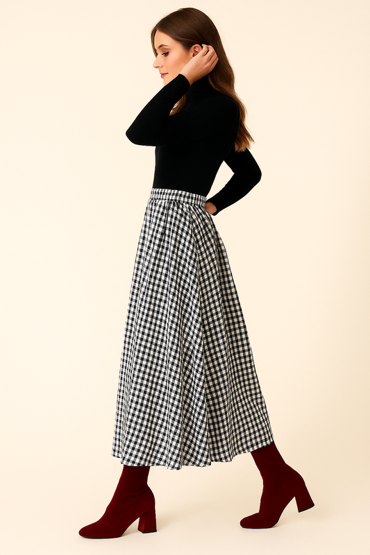 THE AUDREY GINGHAM CHECKED MIDI BLACK & WHITE SKIRT