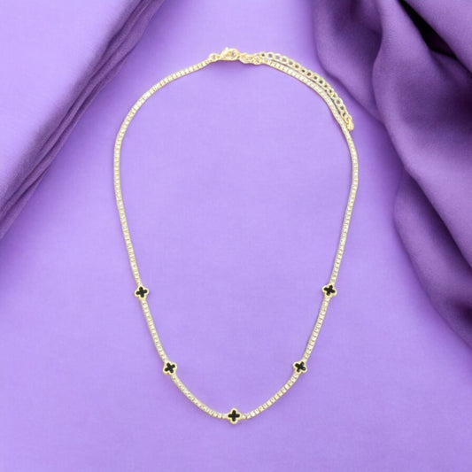Black Shell Clover Station Charms Rhinestone Chain Necklace