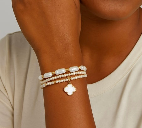 Glass Clover Charm Mixed Fresh Water Pearl Beaded Bracelet Set
