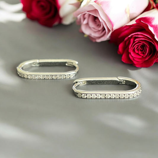 Silver Dipped Cz Pave Edge Oval Hoop Earrings