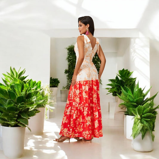 COLOR-BLOCK V NECK SLEEVELESS TIERED FLORAL PRINT MAXI DRESS