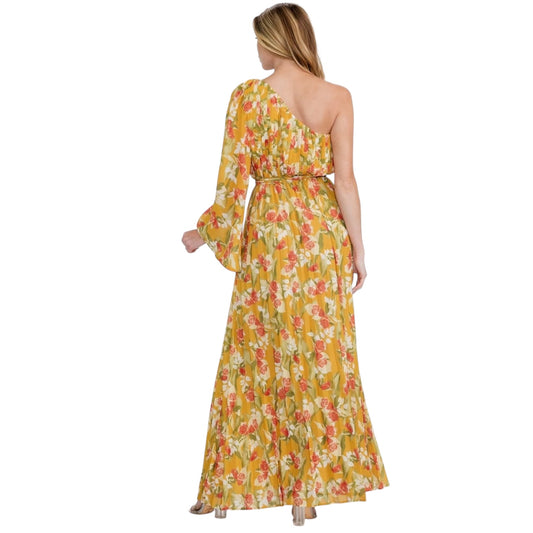 PLEATED WOVEN MUSTARD FLORAL ONE SHOULDER TIE WAIST MAXI DRESS