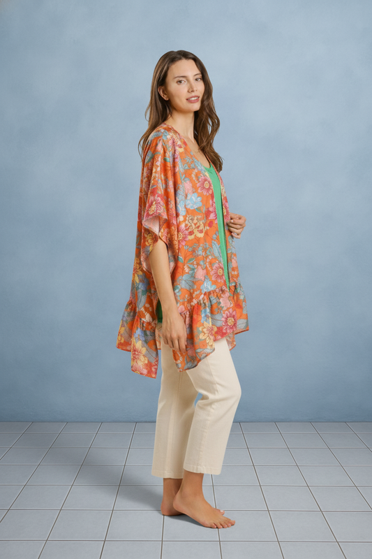 TANGERINE TROPIC BLOOM RUFFLE SLEEVE KIMONO