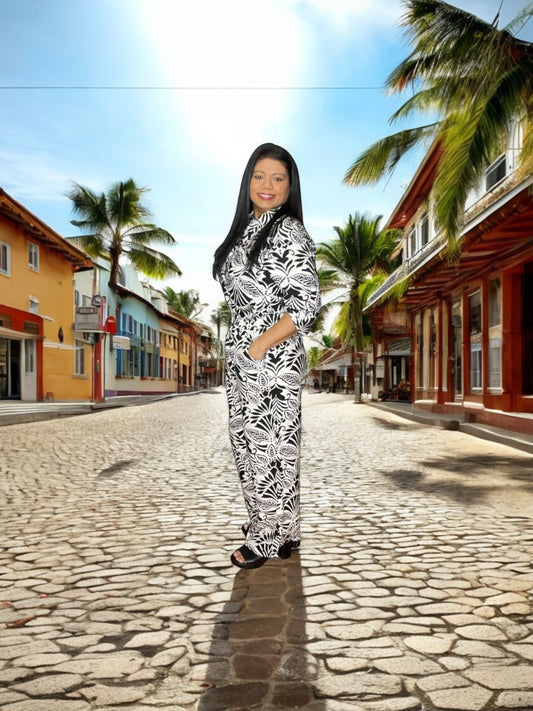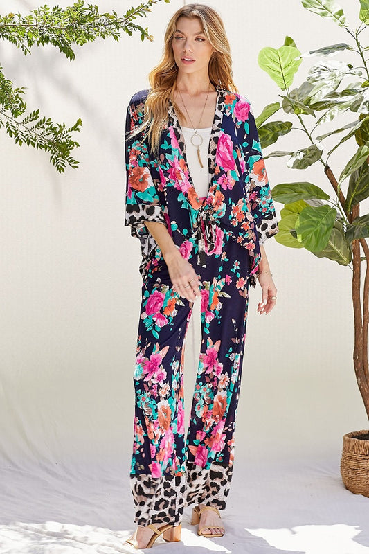 FLORAL AND LEOPARD MIX PRINT KIMONO PANTS RESORT SET