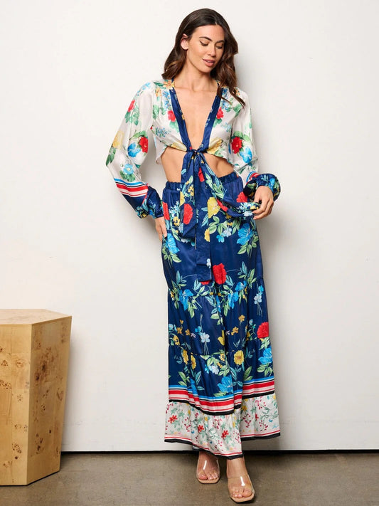 FLAMINGO BLOOM FLORAL CROP TOP MAXI SKIRT SET