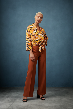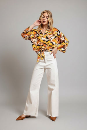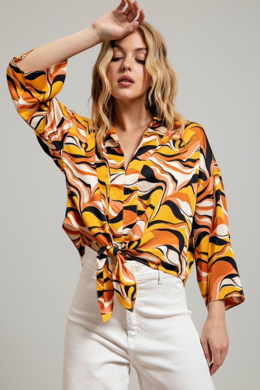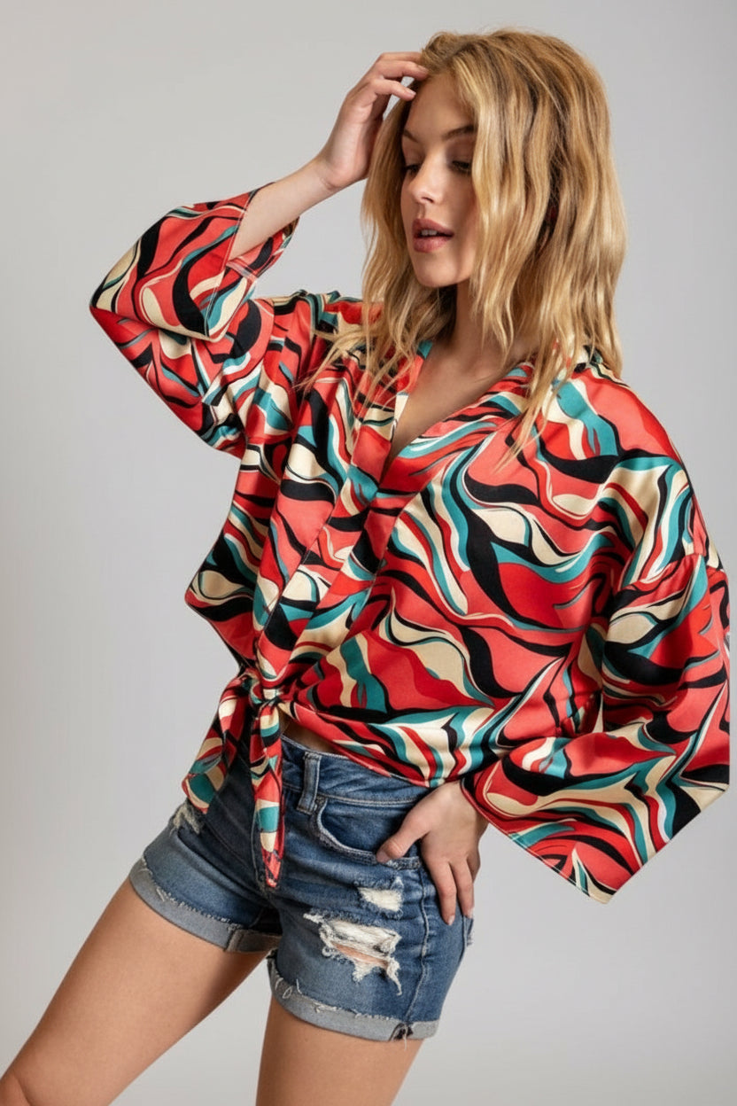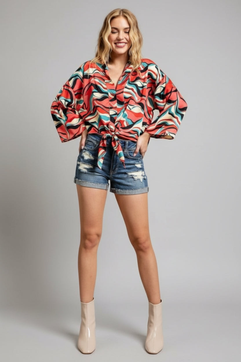 Embrace bold style with the Retro Wave Tie Abstract Wide Sleeve Top. Featuring eye-catching abstract patterns and dramatic wide sleeves, this top adds a unique flair to your wardrobe. The tie detail enhances its retro charm while offering a customizable fit. Perfect for making a statement at any casual or dressy occasion, it combines comfort and standout design effortlessly. Elevate your look with this versatile, fashion-forward piece.