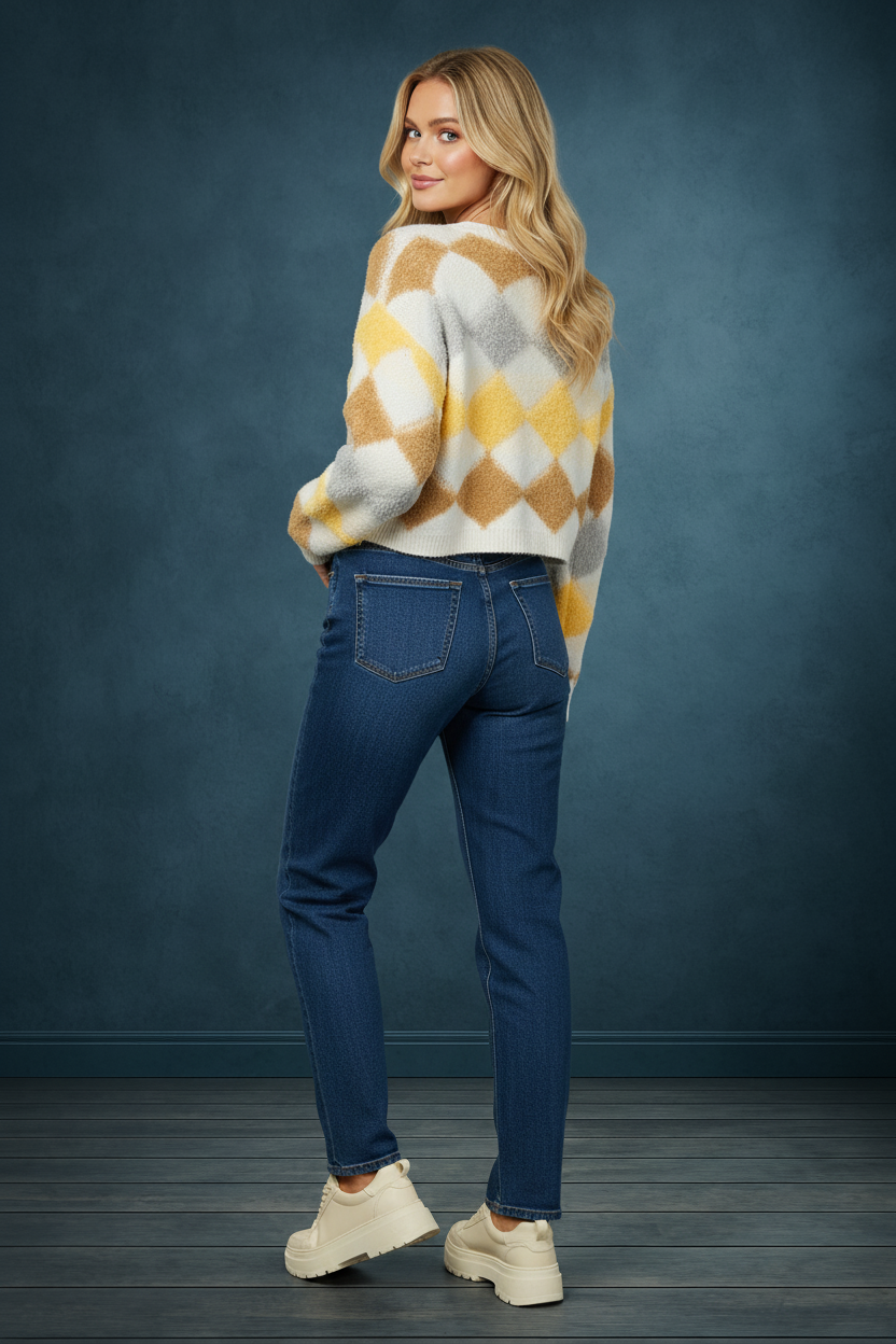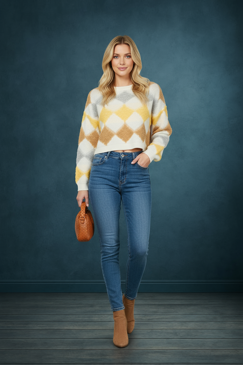 Elevate your wardrobe with the Amber Argyle Diamond Cropped Pullover Sweater. Its timeless argyle diamond design paired with a chic cropped fit creates a versatile piece that effortlessly blends classic style with modern flair. Comfortable and eye-catching, this sweater is perfect for making a confident statement whether layered or worn alone. Don’t miss out on the chance to add this must-have staple to your collection