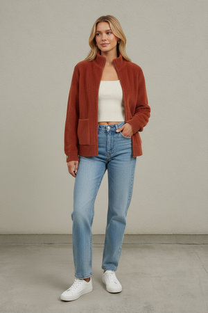 Soft and cozy 100% Polyester fabric, flattering long sleeve silhouette, convenient pockets, on-trend zip-up design, versatile and easy to style, perfect for fall layering or gifting.