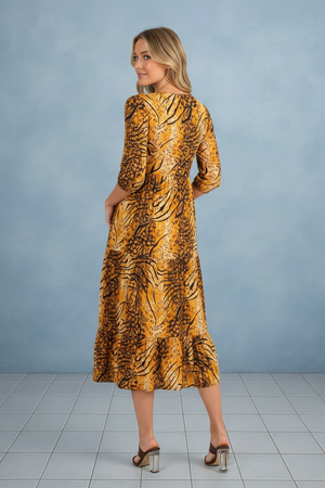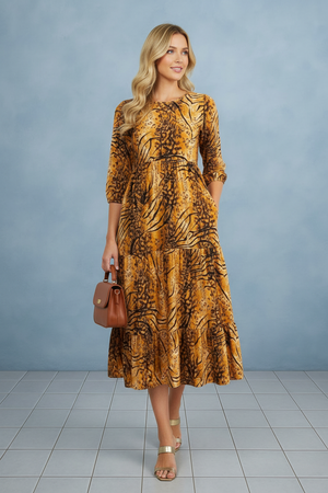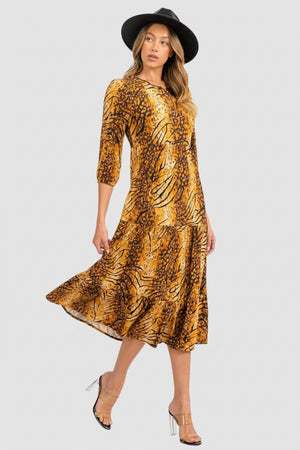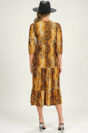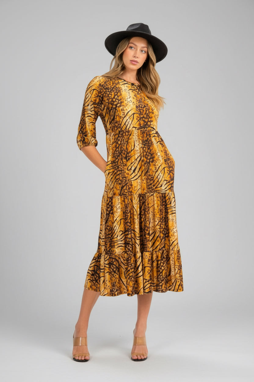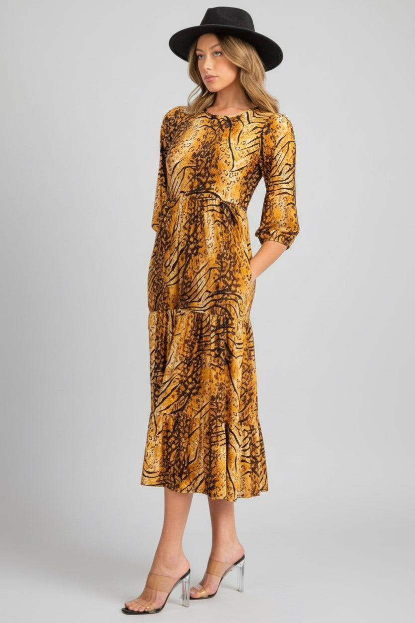 Tiger Print Blossom 3/4 Sleeve Front Pocket Tiered Midi Dress