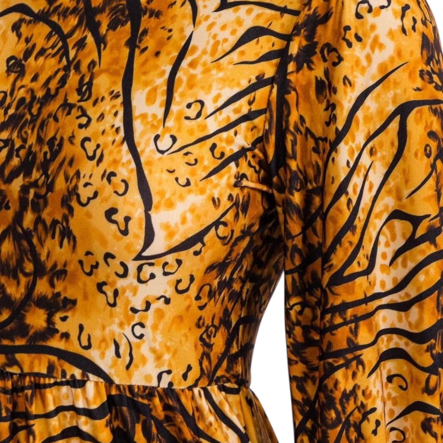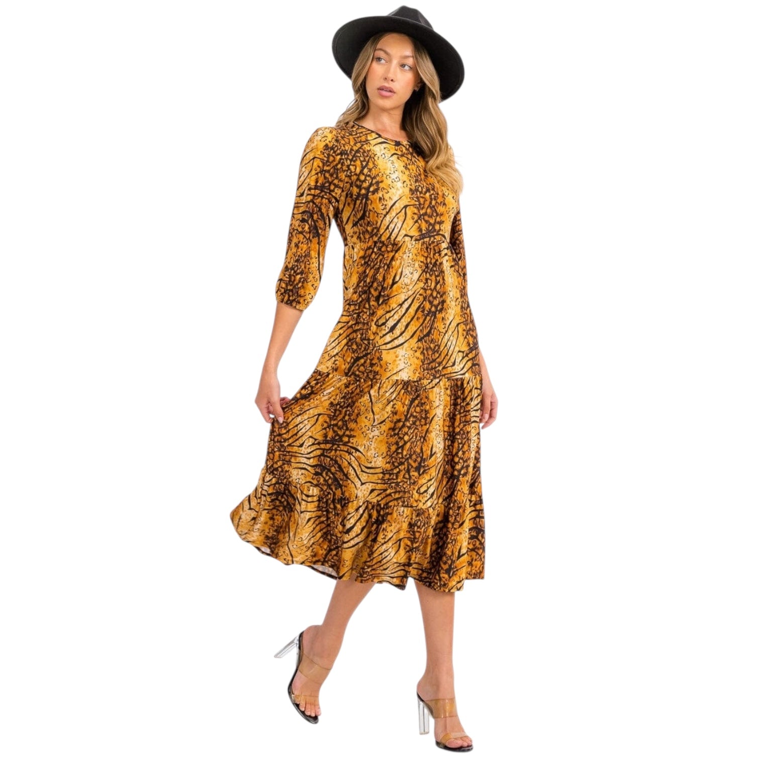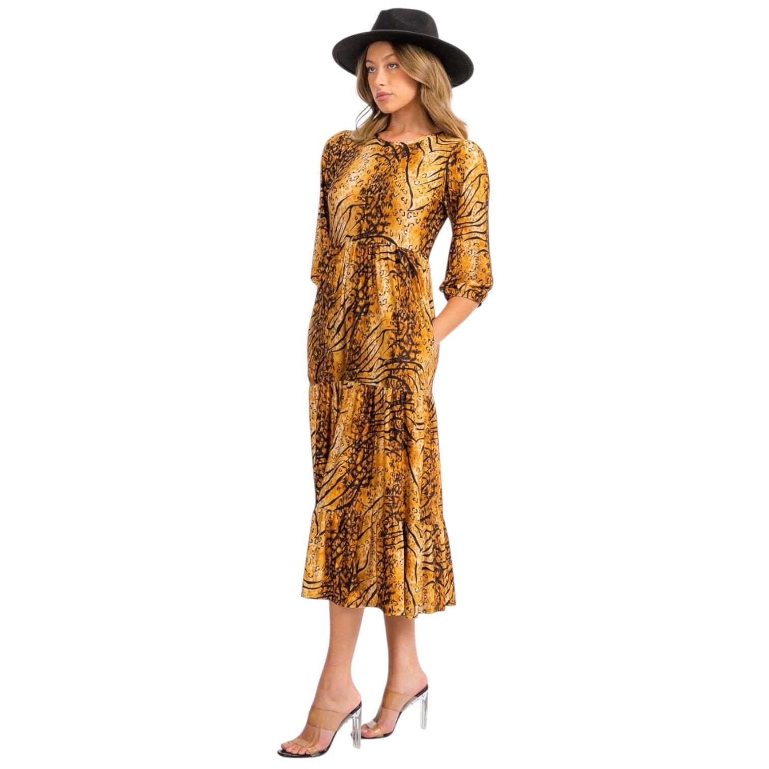 Tiger Print Blossom 3/4 Sleeve Front Pocket Tiered Midi Dress