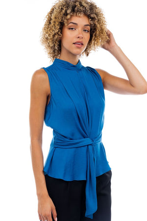 Mock Neck Top with Front Drape Detail Soft woven fabric with an elegant mock neckline for a refined look. Front drape detail adds fluid movement and a flattering finish.