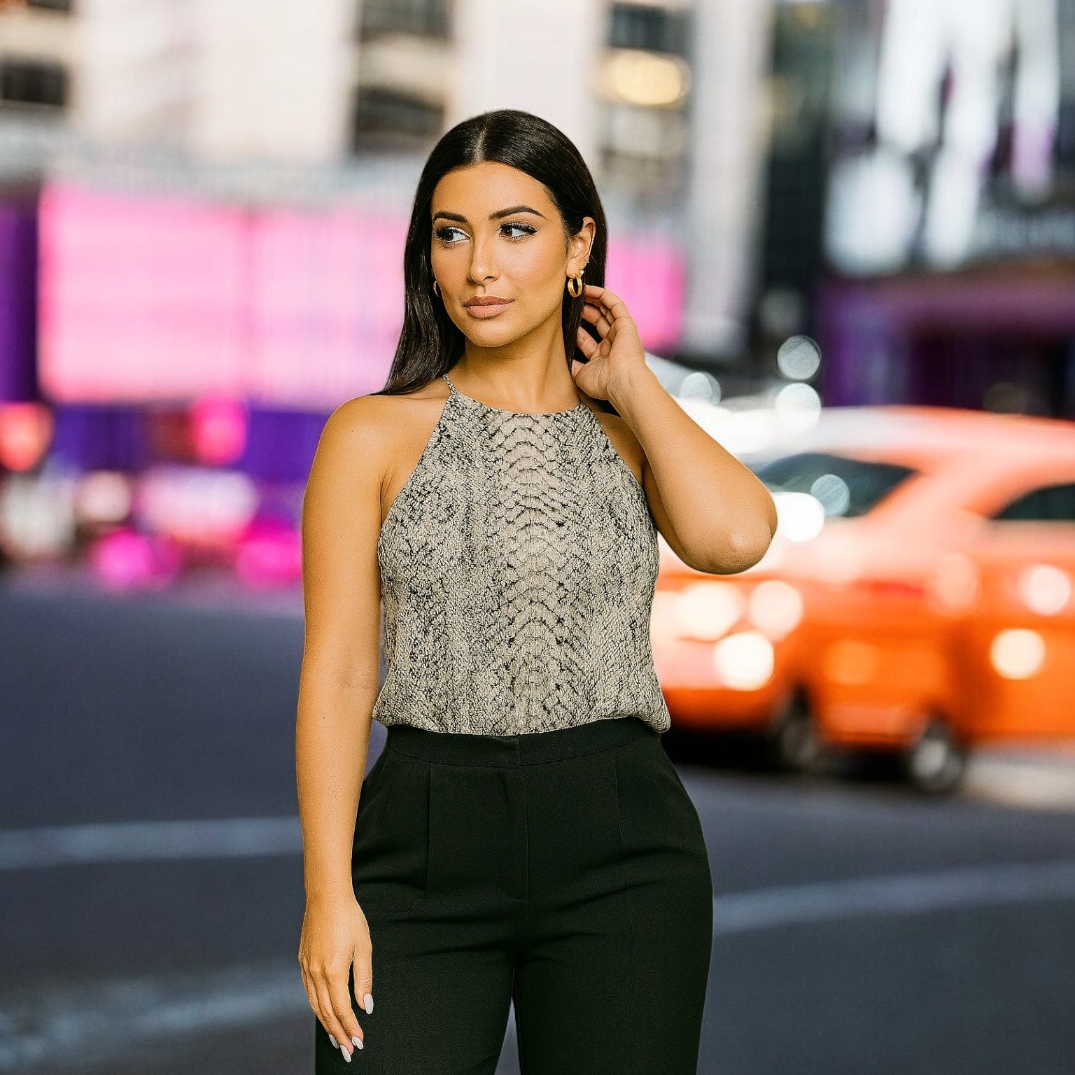 Command the spotlight with the Python Chic Plisse Halter Top, featuring a striking black and cream snake print. Its bold pleated texture and provocative halter neckline create an unapologetically fierce look that empowers you to take risks and stand out. Perfect for those who dare to be different.