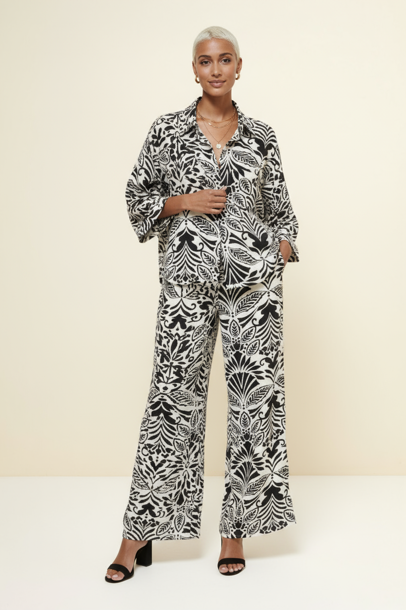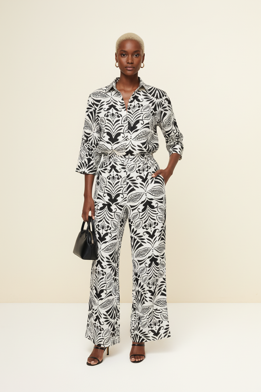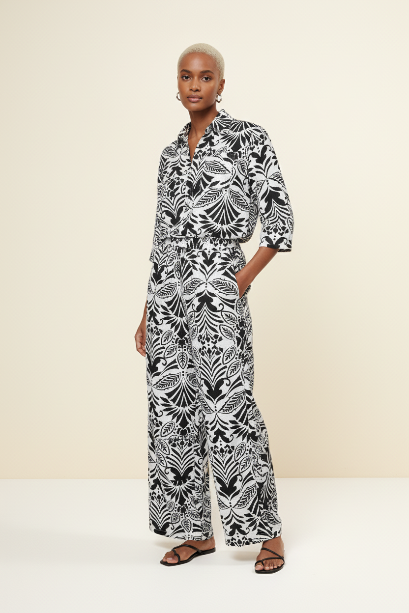Elevate your wardrobe with the Midnight Palms Botanical Wide Leg Two-Piece Set, featuring a refined botanical print that blends elegance with modern style. The wide-leg silhouette offers a flattering, comfortable fit, while the coordinated top completes a polished look perfect for any sophisticated occasion. Crafted to provide both style and ease, this set transitions seamlessly from day to evening wear.