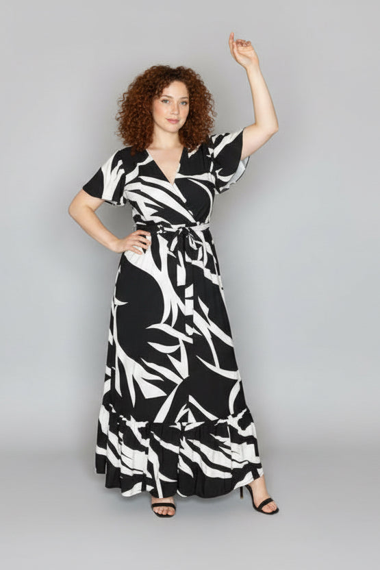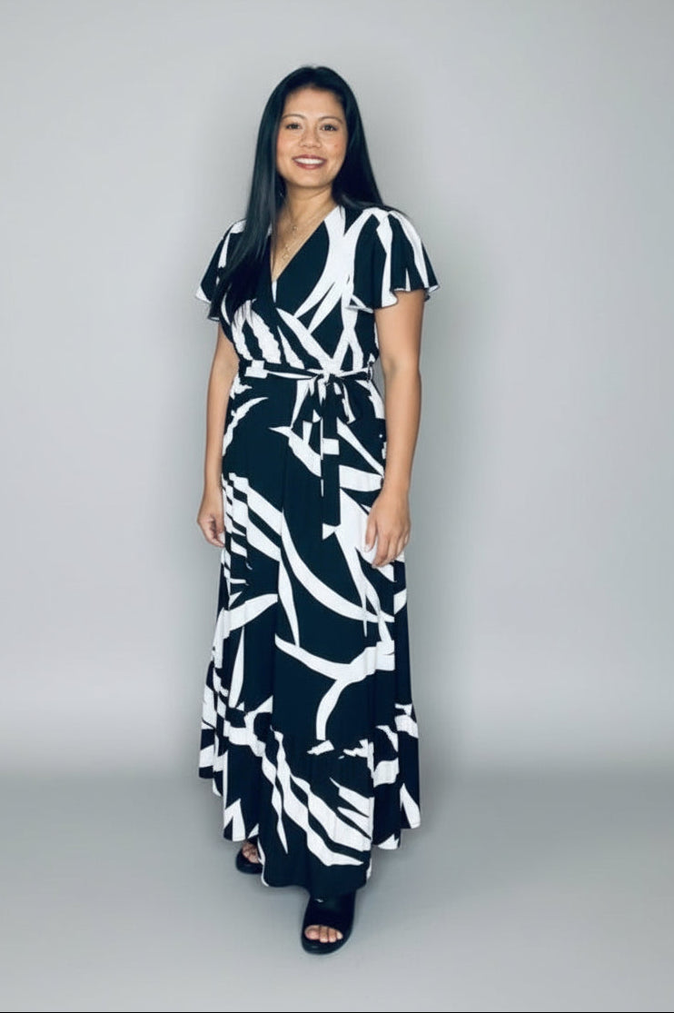 Effortlessly elegant and versatile, the Black & White Crossover Top Floral Long Dress with Tie Belt from Mandalay And Company is essential for every stylish woman. The crossover top highlights your silhouette, and the floral pattern exudes grace. The tie belt cinches the waist for a flattering fit, perfect for any occasion. Crafted from premium fabrics, this dress embodies Mandalay And Company's values: quality, style, and comfort. Elevate your wardrobe with this stunning addition.