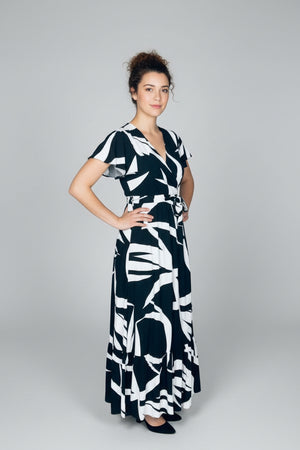Black & White Crossover Top Floral Long Dress With Tie Belt
