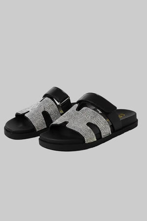 Step into effortless style with the Stardust Black Embellished Slip-On Slides. Featuring sparkling embellishments on a sleek black base, these slides add a touch of glamour to any casual outfit. Designed for easy wear and all-day comfort, they are perfect for elevating your look whether you're out for a stroll or relaxing at home. Make a statement with every step in these chic, versatile slides.