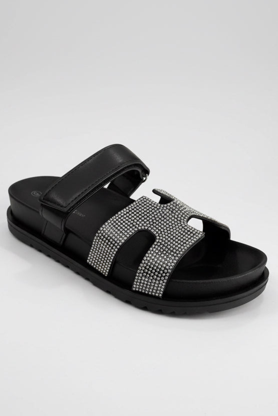 STARDUST BLACK EMBELLISHED SLIP ON SLIDES