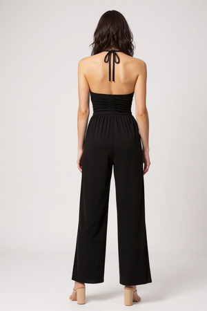 MIDNIGHT MUSE BLACK SMOCKED HALTER WIDE LEG JUMPSUIT