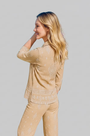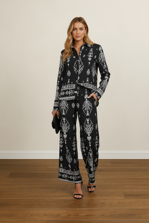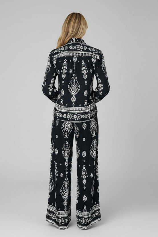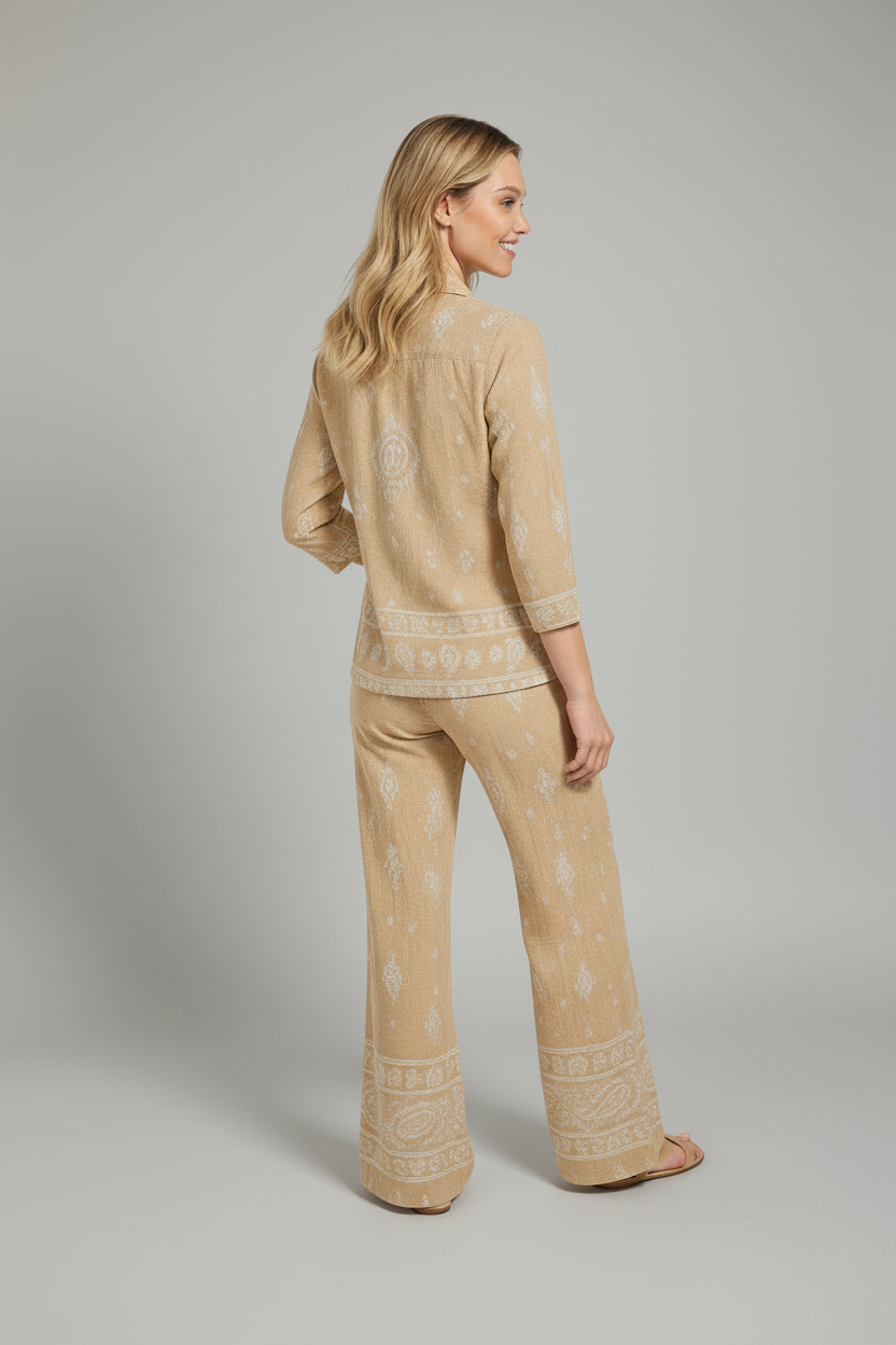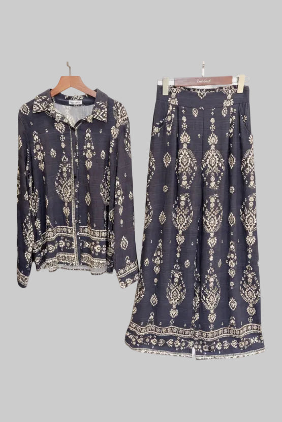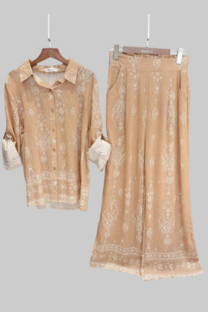 Elevate your style effortlessly with these Paisley Drift Wide Leg Two Piece Sets in colors Noor Nights and Golden Dusk. Featuring a relaxed fit and flowing wide-leg pants, this set combines comfort with chic sophistication. The intricate paisley pattern adds a touch of timeless elegance, perfect for both casual outings and special occasions. Embrace versatile fashion that moves with you and makes a statement wherever you go.