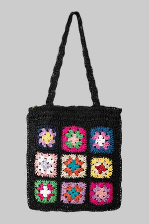 BOHO BLOOM BLACK FLORAL PATCH BRAIDED STRAW TOTE BAG