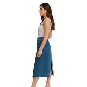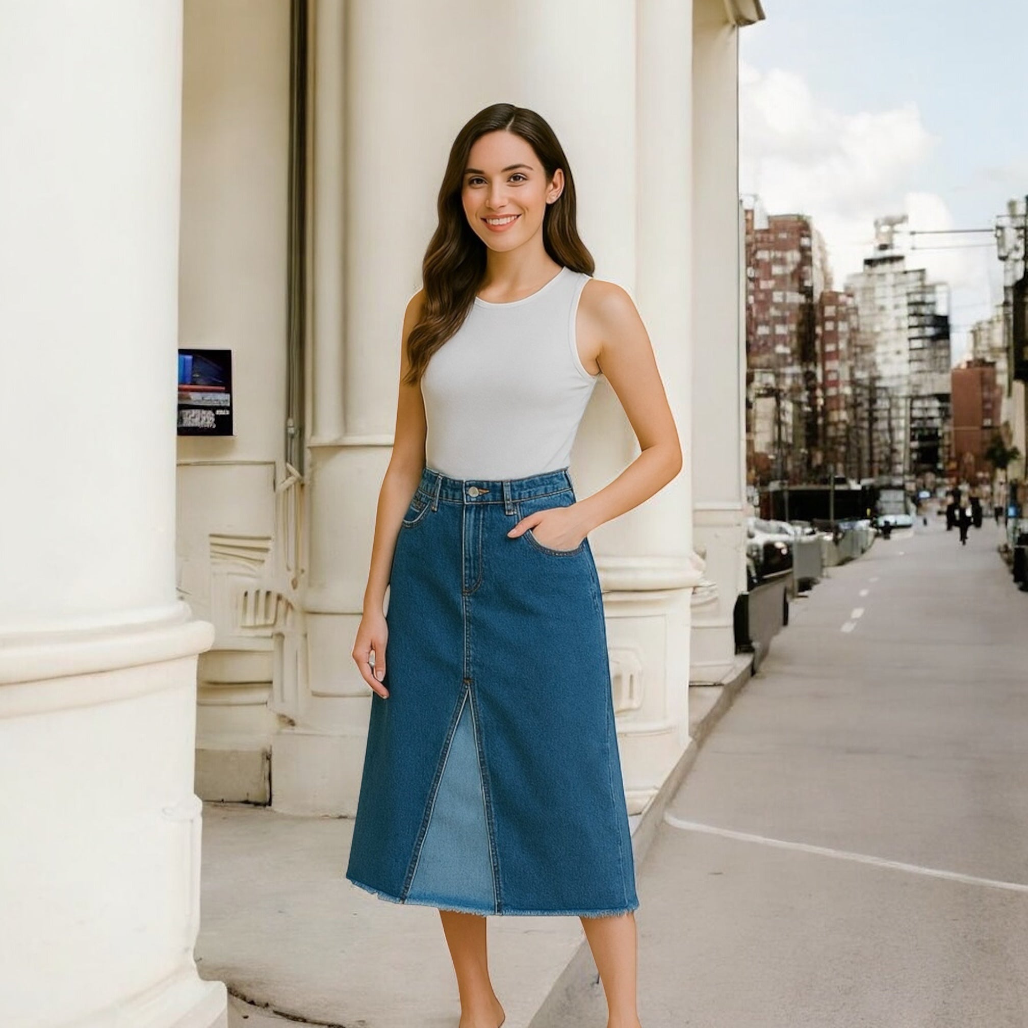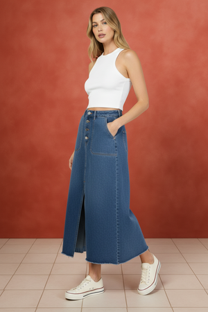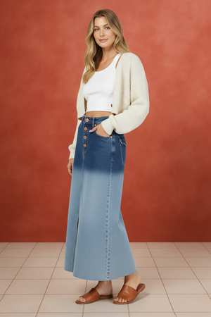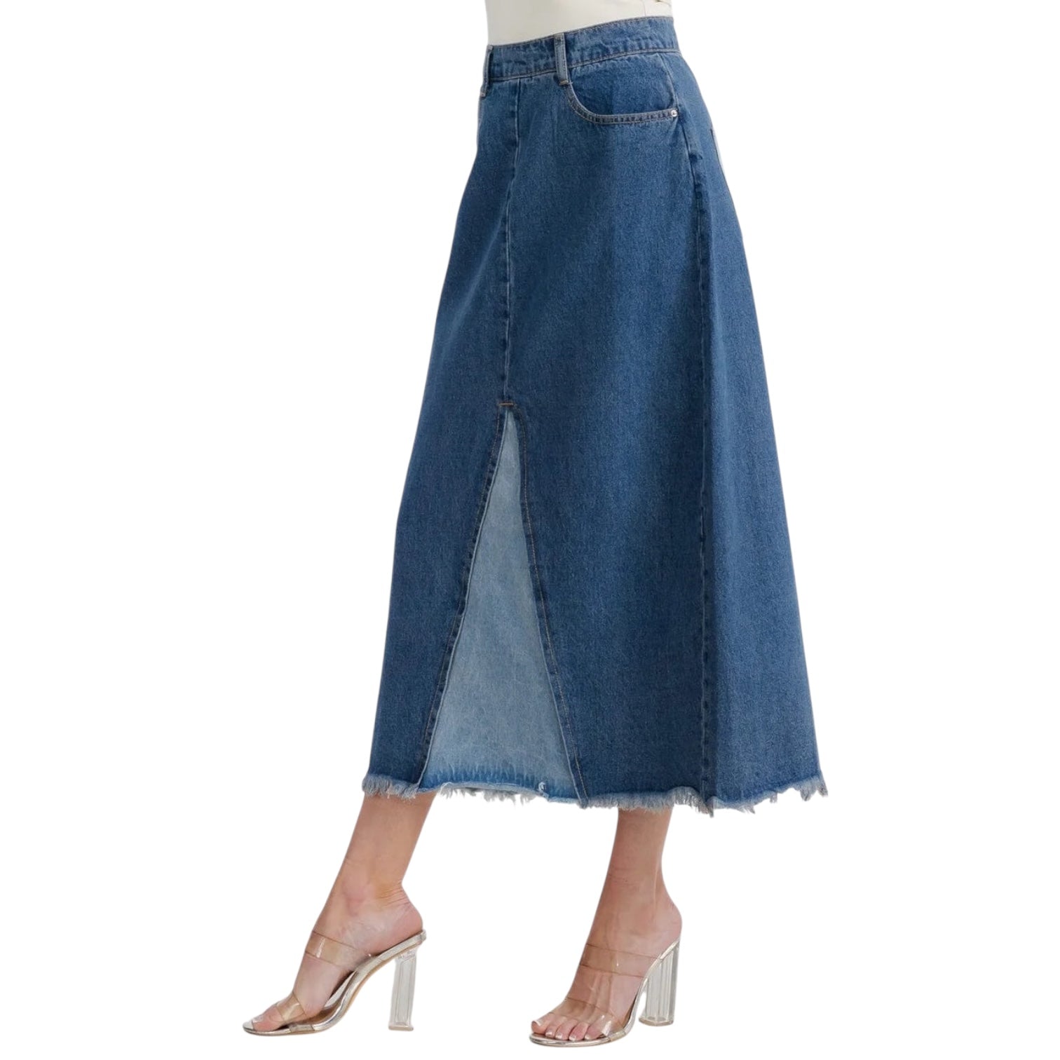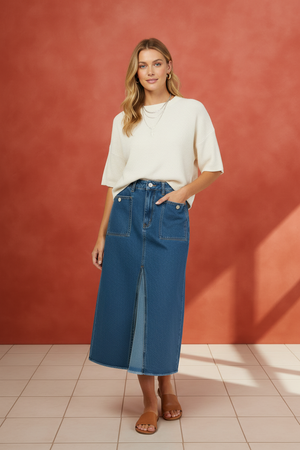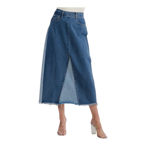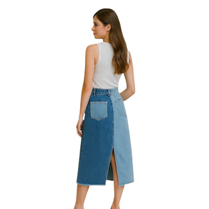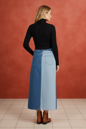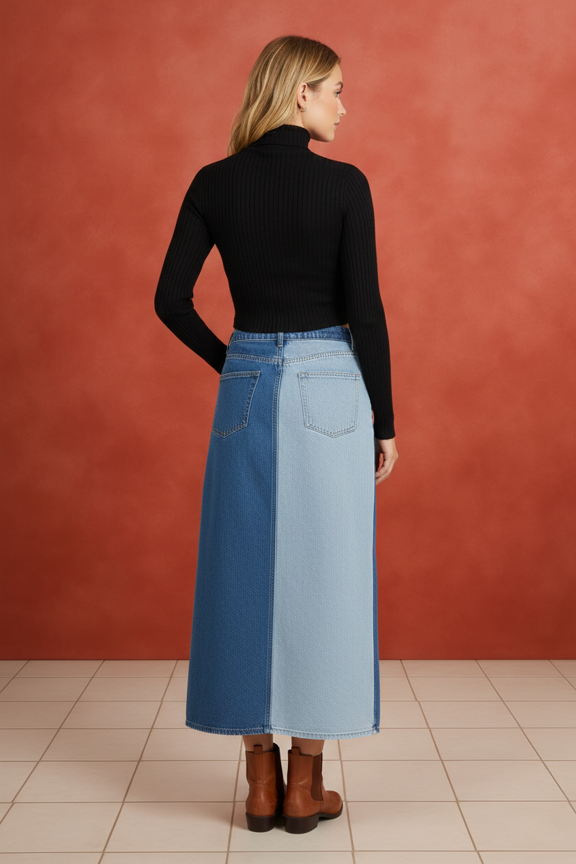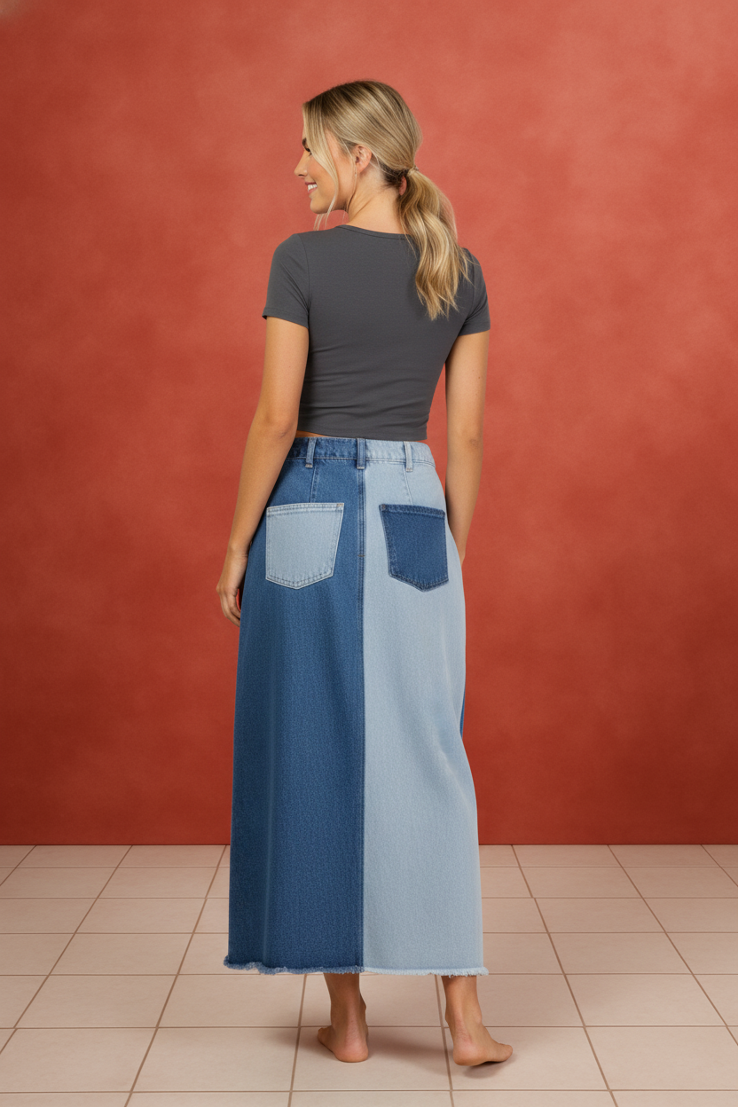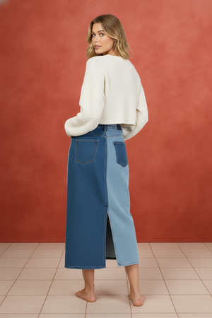 Make a bold statement with the Patchwork Blues Button 2-Tone Denim Midi Skirt. Featuring a unique patchwork design and contrasting denim tones, this skirt combines classic style with modern flair. The button-front detail adds a touch of sophistication, while the midi length offers versatile wear for any occasion. Elevate your wardrobe with this standout piece that effortlessly blends comfort and trend-forward style.