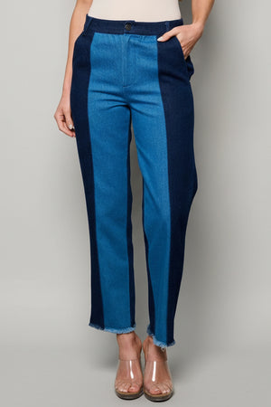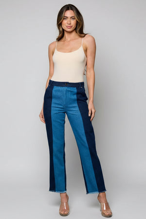 Elevate your wardrobe with these Two Tone Button Closure Straight Leg Denim Pants. Featuring a stylish two-tone design and secure button closure, they offer both fashion and function. The Straight-leg cut ensures comfort and a flattering silhouette, while spacious pockets add practicality. Perfect for making a bold statement with effortless ease.