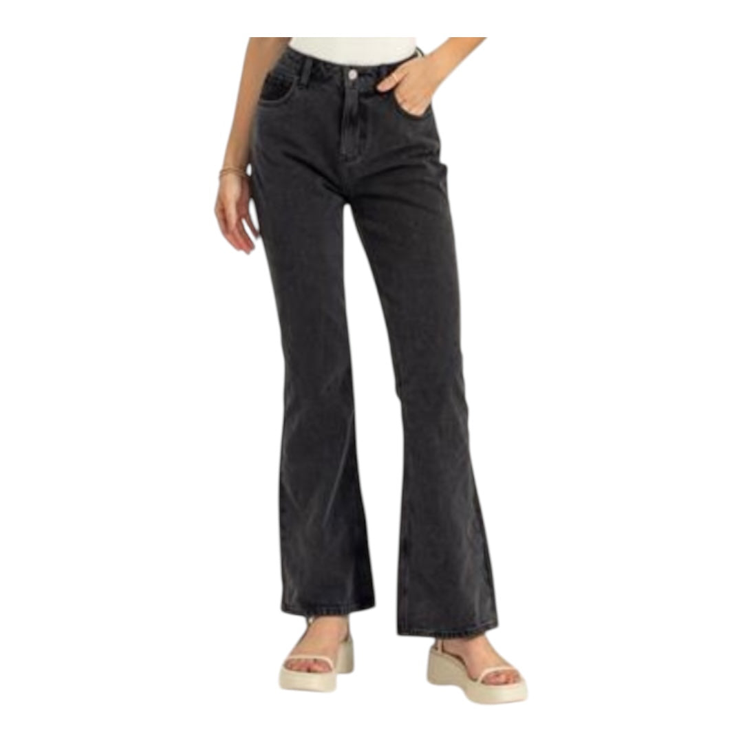 Elevate your style with these Charcoal High Waisted Flare Jeans, featuring a secure zipper fly and classic 5-pocket design. The high waist flatters your silhouette while the flare bottom adds a trendy, elongating effect. Crafted for comfort and versatility, these jeans effortlessly transition from casual days to chic evenings.