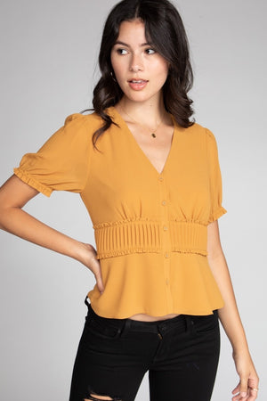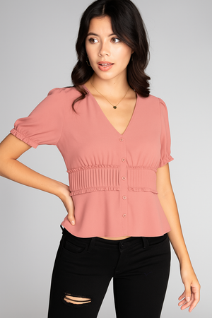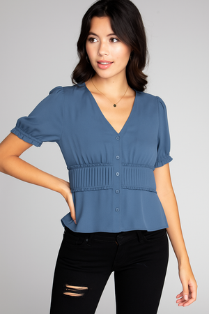 Button Down Pintuck Detail Short Sleeve Blouse Pintuck accents and a button-down front add a tailored touch to this feminine style. Short sleeves and lightweight woven fabric keep it easy and breathable.