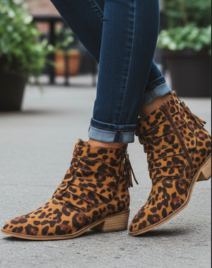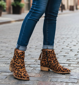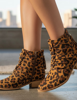 Unleash your wild side with our Chloe Leopard Faux Suede Print Cutout Ankle Booties! Perfect for adding a fierce touch to any outfit, these booties feature a trendy leopard print and stylish cutout ankle design. Step out in style and make a statement with these must-have booties.