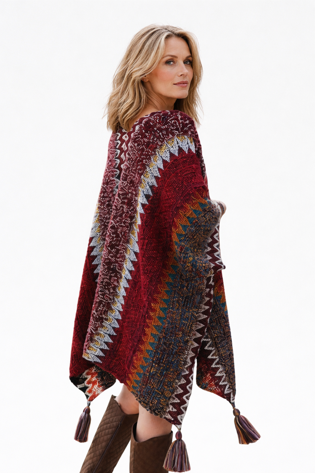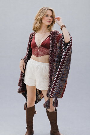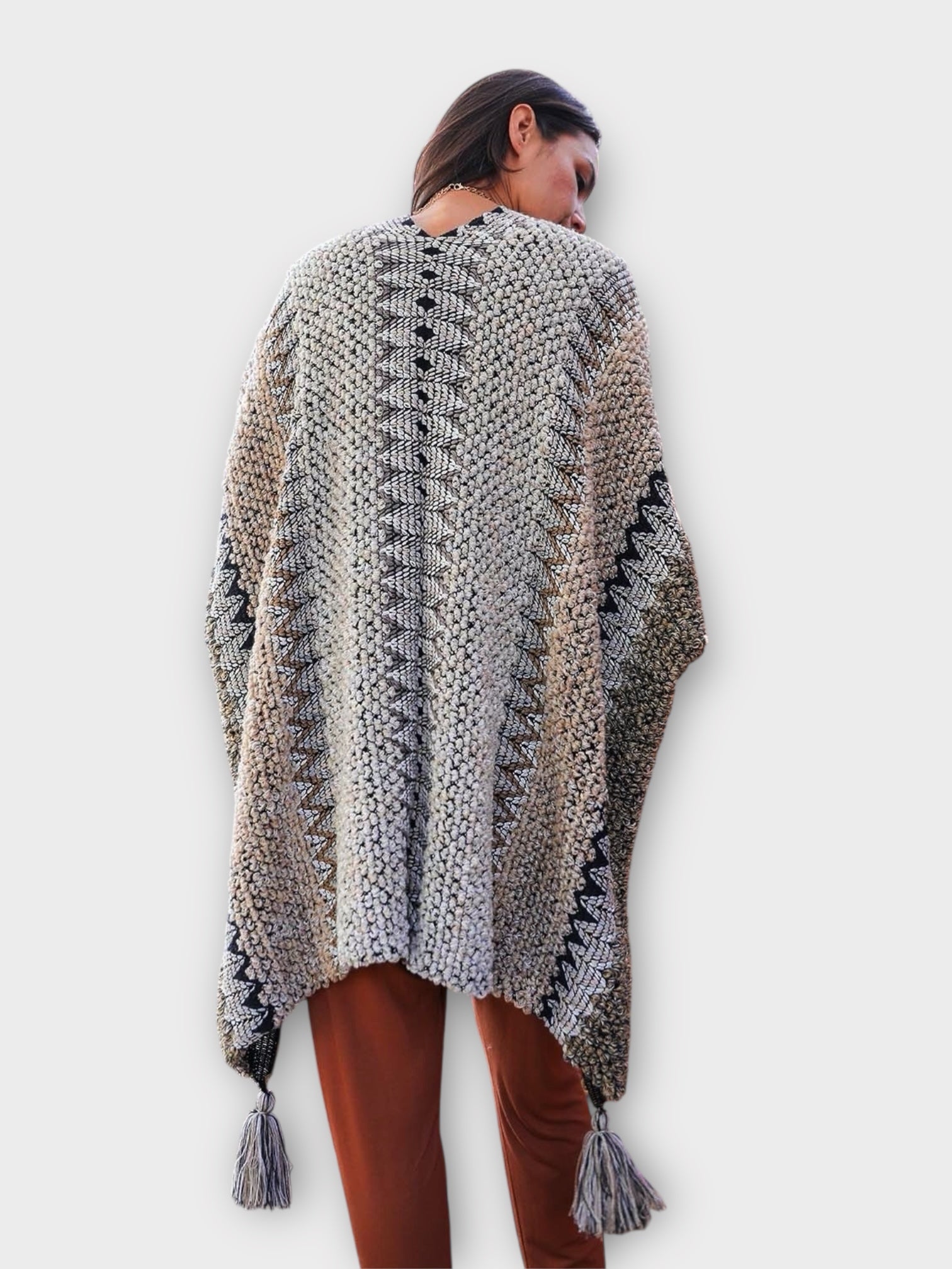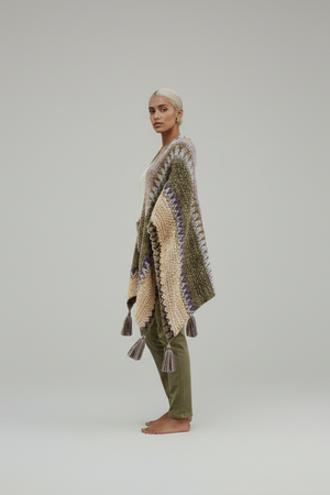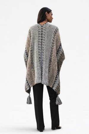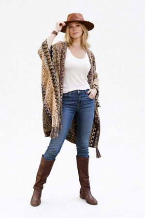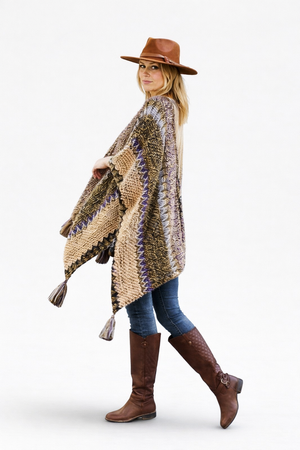 Wrap yourself in vibrant warmth with the Colorful Sunset Draped Tassel Crochet Ruana. This playful piece features a cozy crochet design bursting with sunset shades and fun tassels that sway as you move. Perfect for adding a cheerful pop of color and comfort to any outfit or occasion.