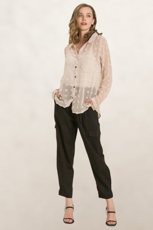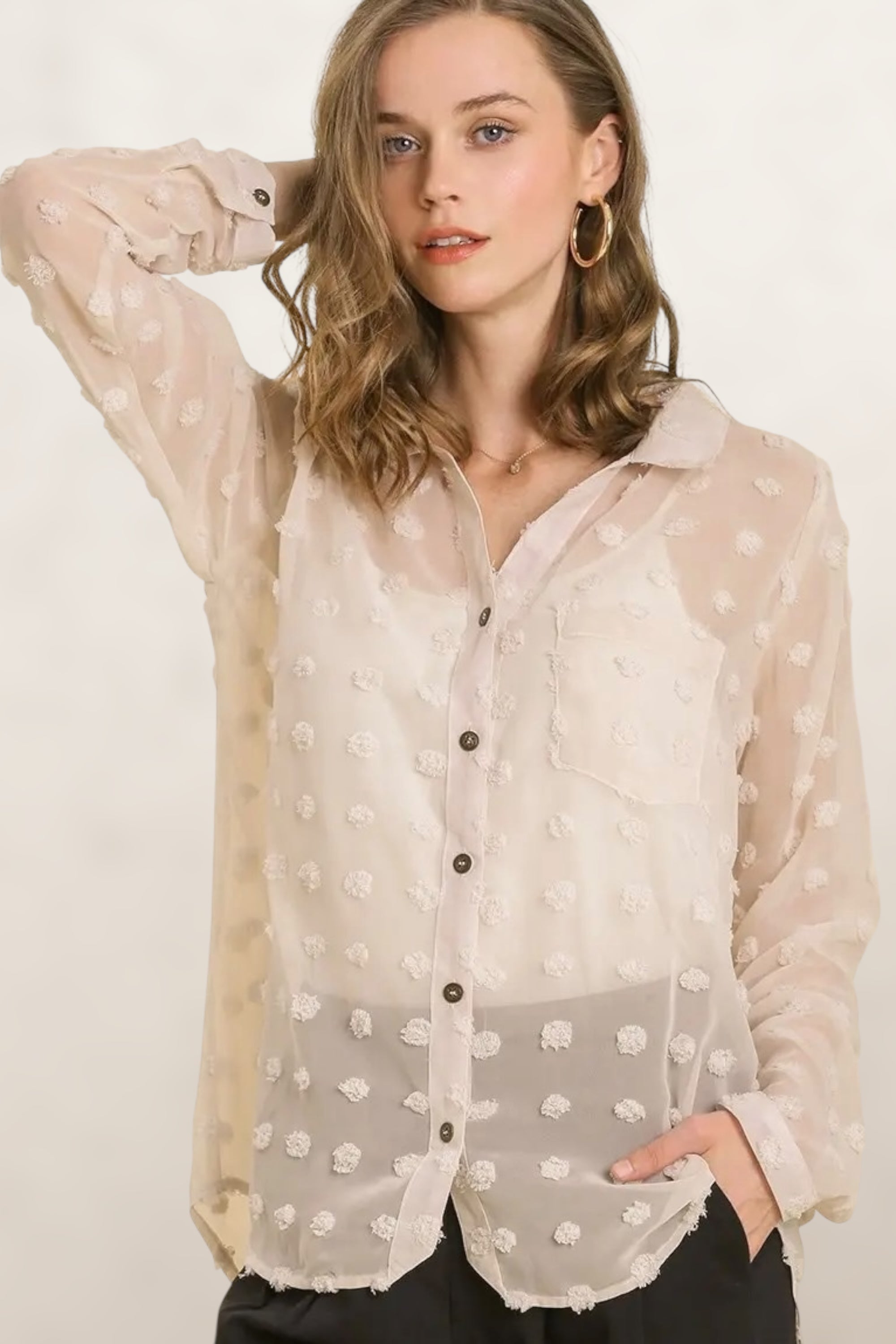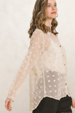 Sheer Collar Button Down Swiss Dot Top with No Lining
