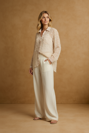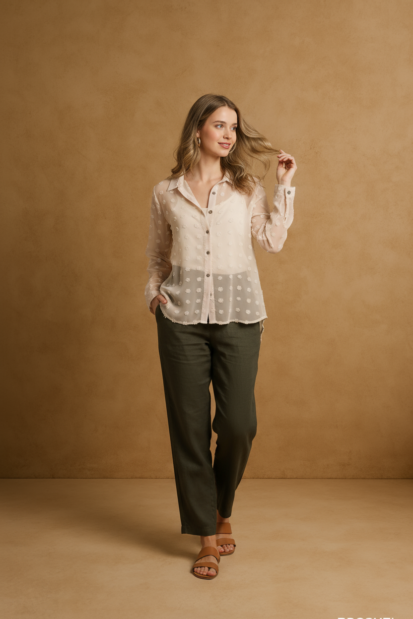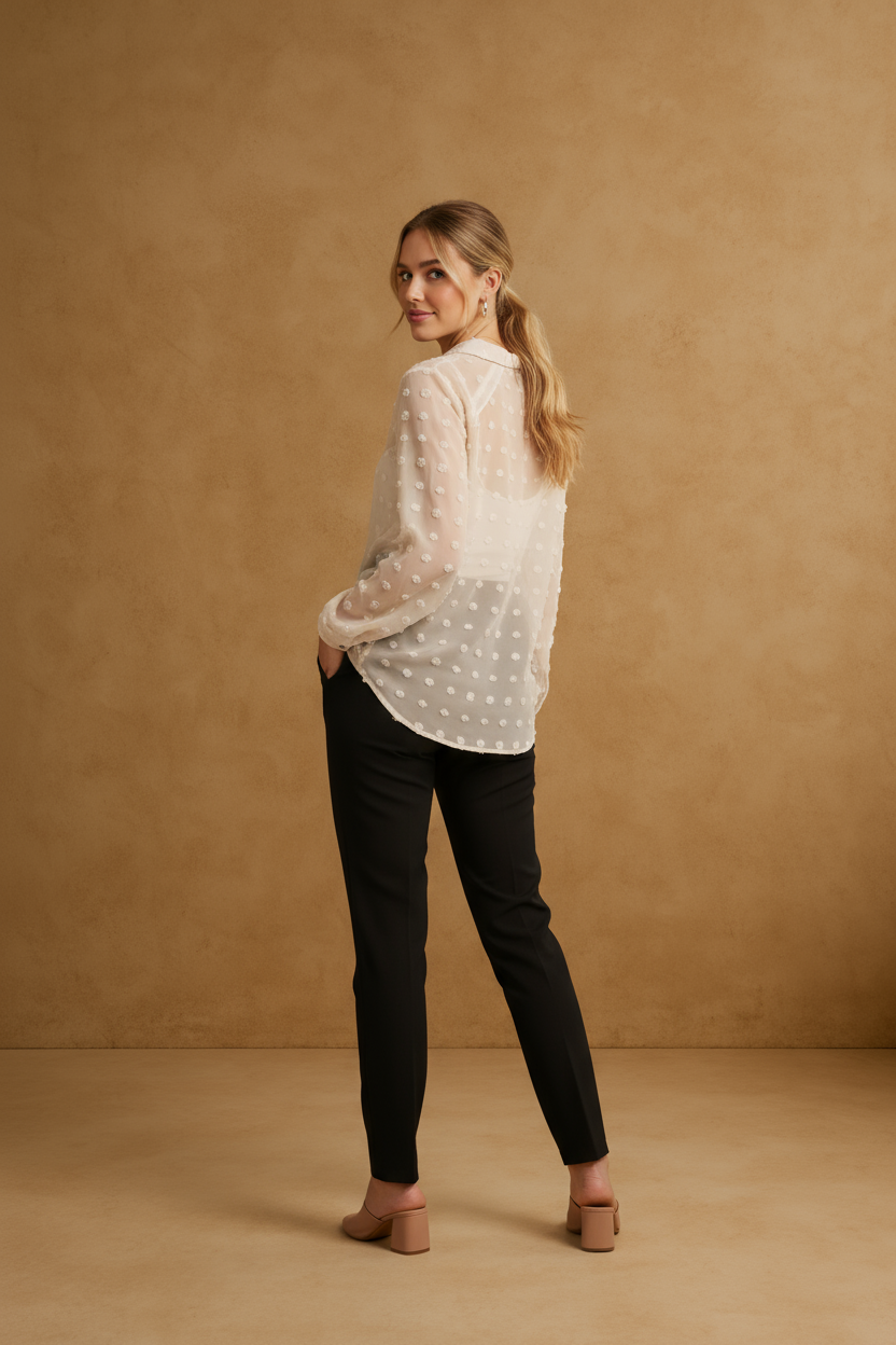 Add a touch of elegance to your wardrobe with the Daydream Sheer Swiss Dot Collar Shirt. Its delicate sheer fabric and subtle Swiss dot texture create a light, feminine look perfect for any occasion. The classic collar adds a polished finish, making it easy to dress up or down. Experience breathable comfort while showcasing timeless style in this versatile shirt.