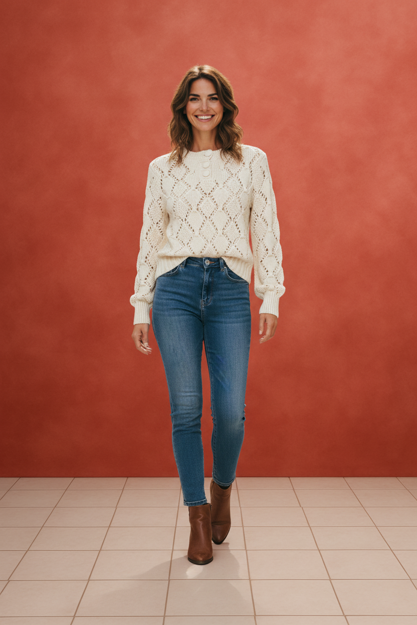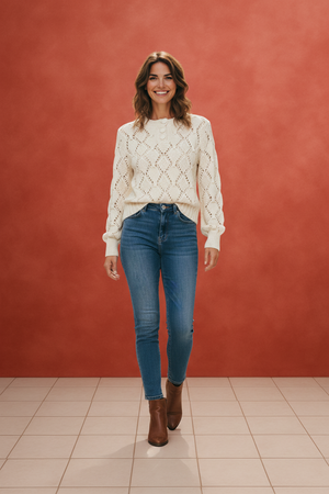 The Diamond Whisper Pointelle Knit Pullover Sweater embodies refined craftsmanship with its intricate diamond pointelle pattern. This elegant piece offers a lightweight, breathable texture that enhances both comfort and style, making it an exquisite choice for a polished wardrobe. Perfect for sophisticated layering or standalone wear, it seamlessly blends timeless design with understated luxury.