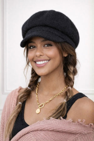 Make a statement this season with our eyelash knit newsboy cap—a bold fusion of retro elegance and modern edge. The distinctive textured knit catches light beautifully, adding dimension to any winter ensemble. This timeless silhouette works hard to frame your face while keeping you cozy, whether you're strolling through the city or bundling up for outdoor adventures. Versatile enough to pair with casual denim or dress up your coat collection, this cap transforms a simple outfit into a polished, intentional look that showcases your unique style sensibility.
