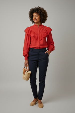 The Flamenco Cascade Eyelet Ruffle Blouse showcases exquisite eyelet craftsmanship and gracefully layered ruffles for a refined, elegant look. This blouse combines delicate textures with a sophisticated silhouette, making it perfect for enhancing your wardrobe with a timeless and polished style. Its subtle details and flowing design provide effortless femininity and versatility for both special occasions and upscale everyday wear.