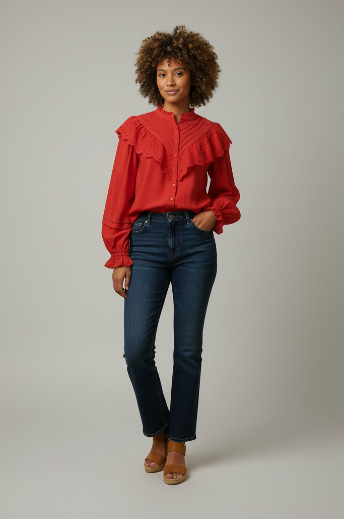 Button closure, ruffle eyelet detail, long sleeves, versatile design, breathable fabric.