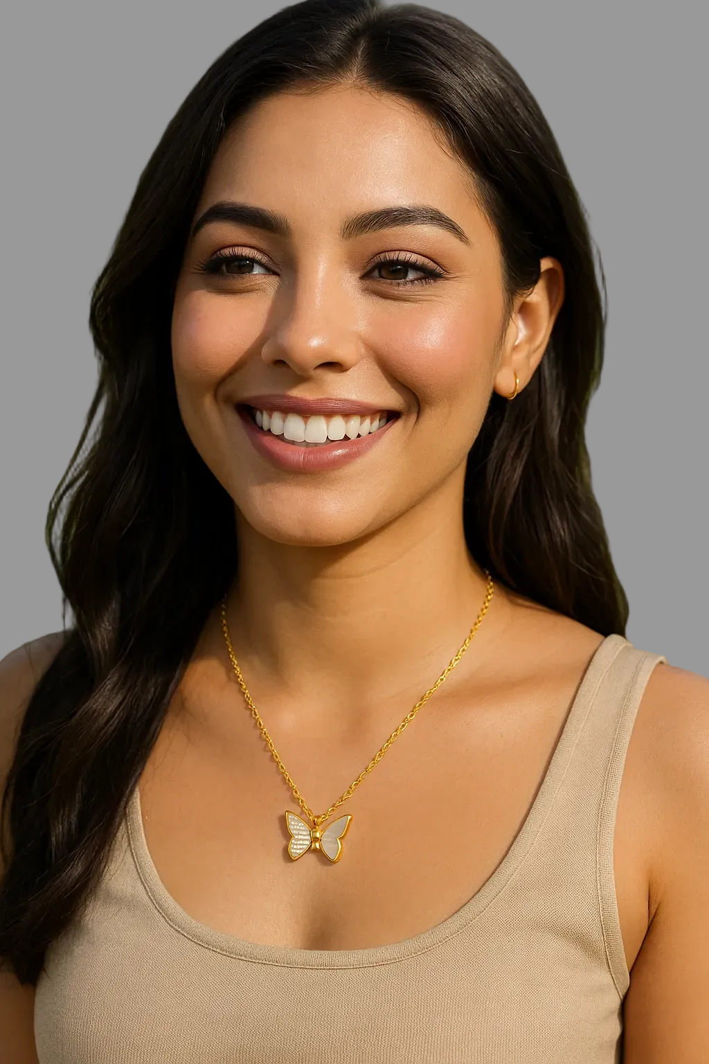 Elevate your style with the Gold Dipped Shell And CZ Pave Butterfly Pendant Necklace from Mandalay And Company. This elegant piece features a butterfly design with CZ pave stones, perfect for any outfit. Our commitment to quality ensures a long-lasting accessory. Embrace nature's beauty and make a statement with this stunning necklace.