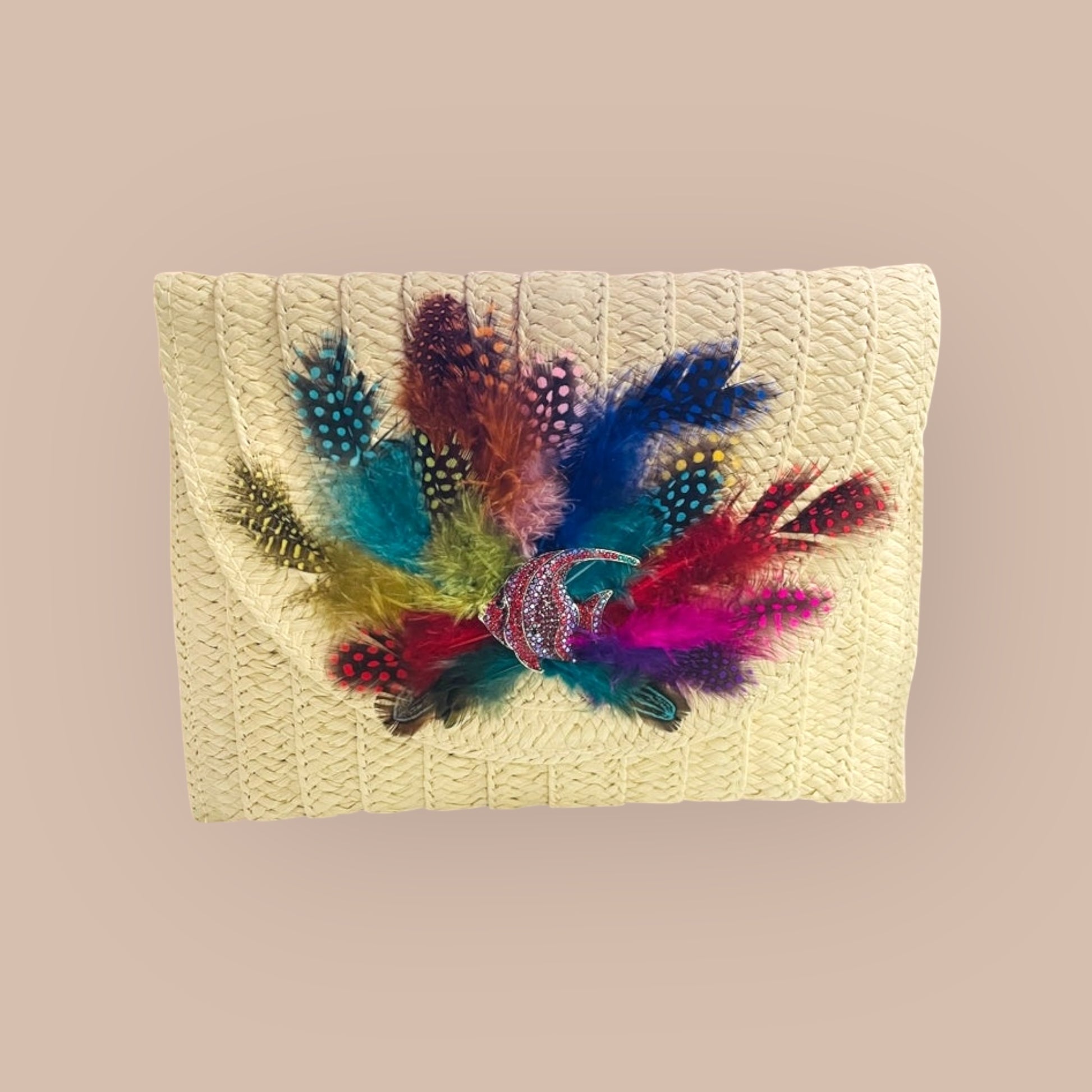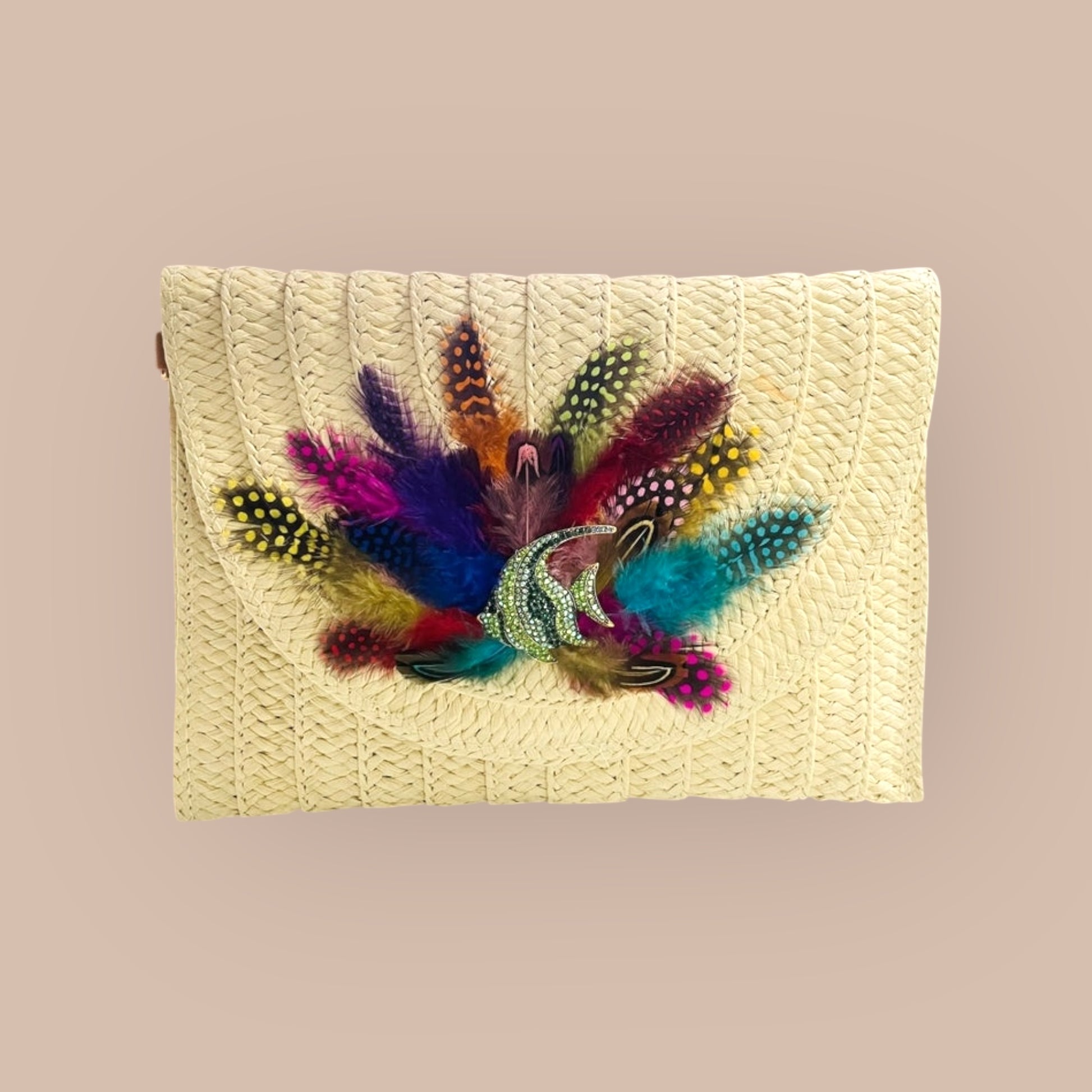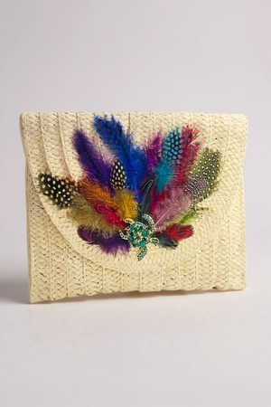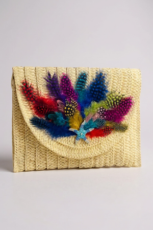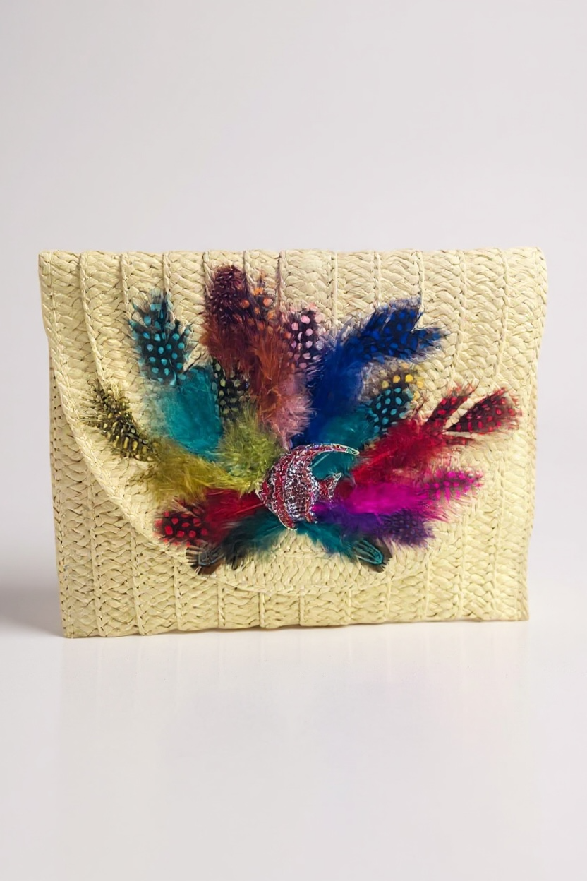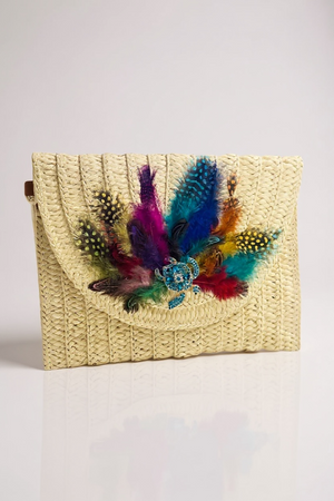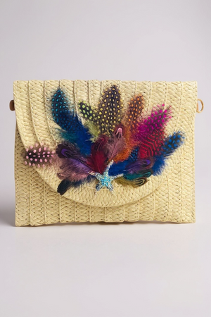 Indulge in the unique and artistic design of our Hand Designed Layered Paper Braided Envelope Clutch Bag! Handcrafted with colorful feathers and adorned with assorted Ocean Creatures Crystal Brooches, this clutch exudes elegance and charm. Carry it as a clutch or rock it as a crossbody bag - either way, it's sure to turn heads and make a statement. Elevate your style and add a pop of personality with this one-of-a-kind accessory. These Hand bags/ Clutches were created just for Mandalay And Company. Every Bag is one of a kind.