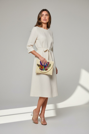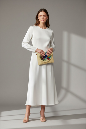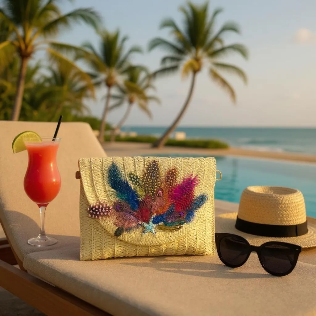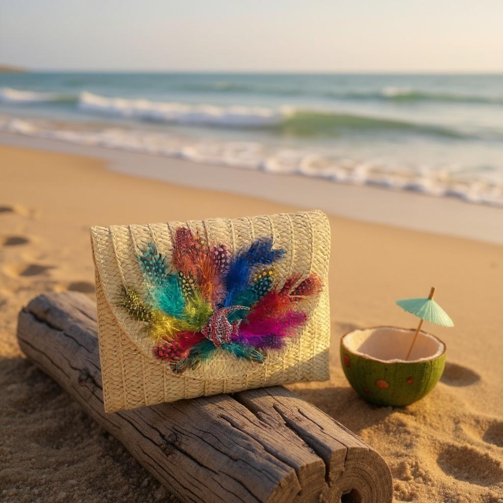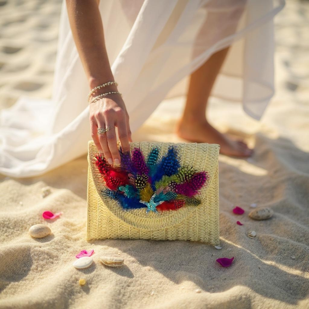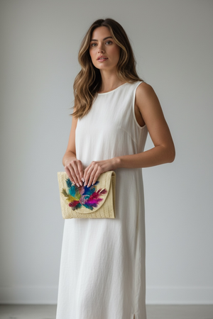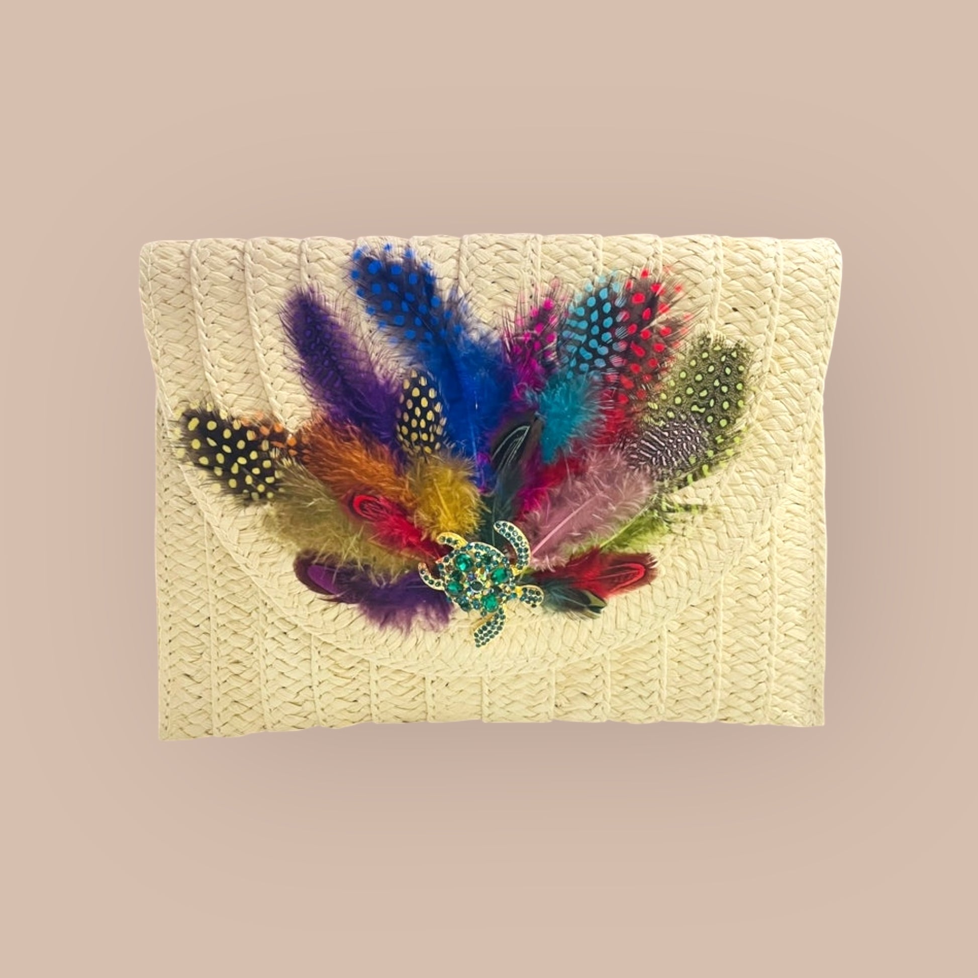 Indulge in the unique and artistic design of our Hand Designed Layered Paper Braided Envelope Clutch Bag! Handcrafted with colorful feathers and adorned with assorted Ocean Creatures Crystal Brooches, this clutch exudes elegance and charm. Carry it as a clutch or rock it as a crossbody bag - either way, it's sure to turn heads and make a statement. Elevate your style and add a pop of personality with this one-of-a-kind accessory. These Hand bags/ Clutches were created just for Mandalay And Company. Every Bag is one of a kind.