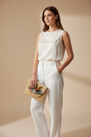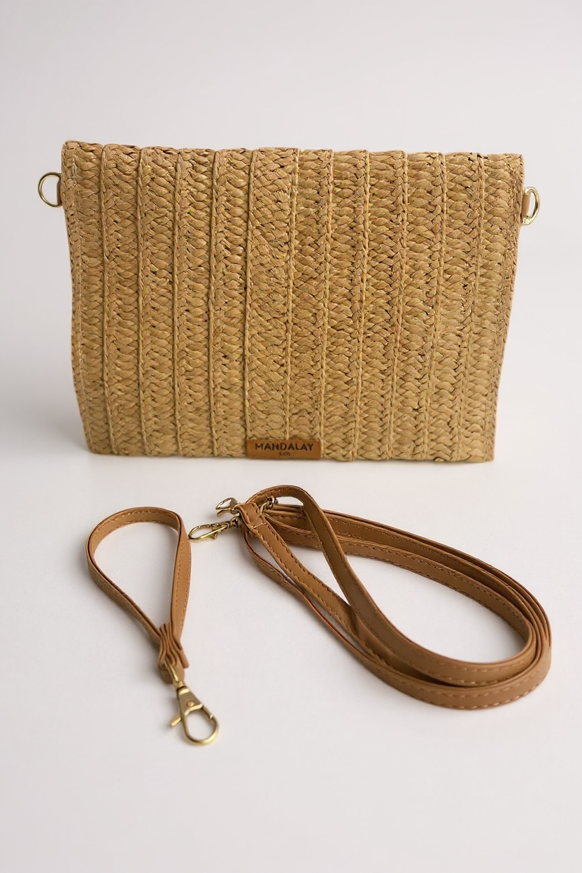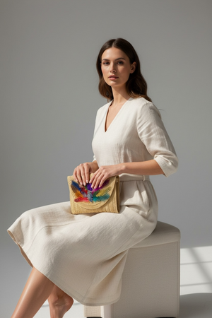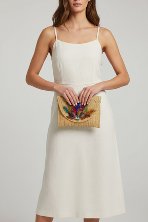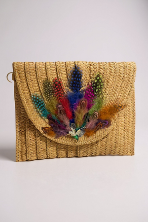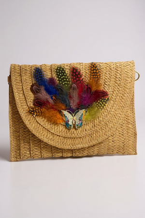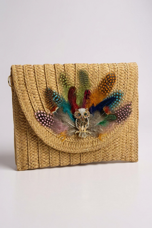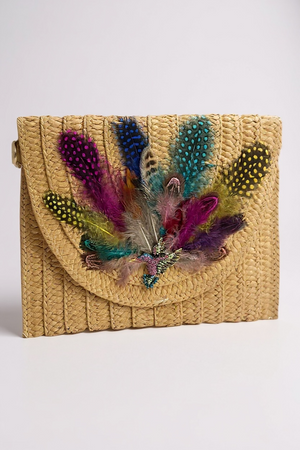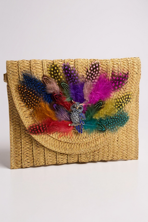 FEATHERED WHIMSY HAND DESIGNED LAYERED STRAW ENVELOPE CLUTCH/ CROSSBODY PURSE