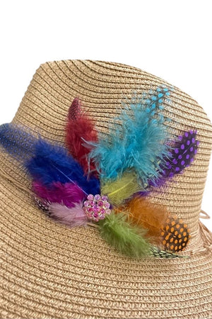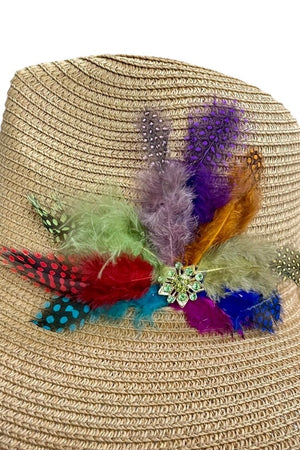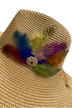 Indulge in the luxurious craftsmanship of this Handmade Feather Design Tan Floppy Fedora Straw Sun Hat. Adorned with a delicate feather and brooch design, this hat exudes sophistication and elegance. Its floppy design provides ample sun coverage and its handmade construction ensures quality and uniqueness. Elevate your summer look with this exclusive and timeless accessory. These Hats are one of a kind designed be Mandalay and Company.