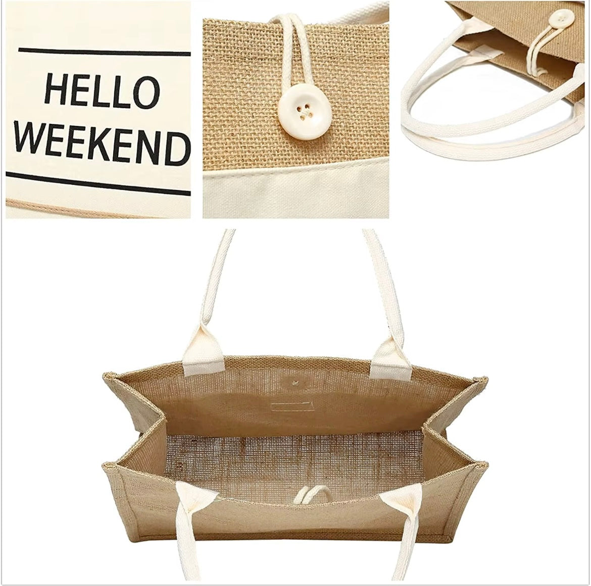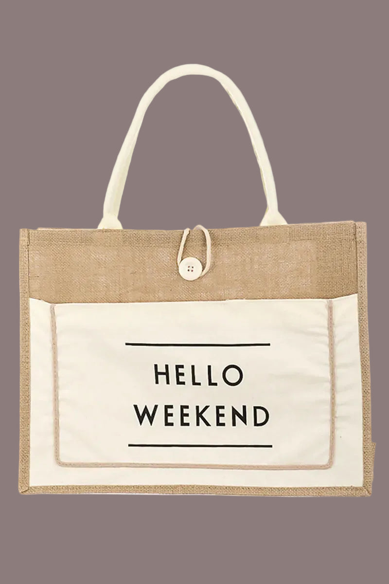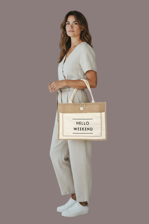 Embrace weekend adventures with our Hello Weekend Burlap Tote Bag from Mandalay And Company. Made from durable, eco-friendly burlap, this stylish tote is perfect for casual outings or grocery runs. Its spacious interior effortlessly carries all your essentials. With "Hello Weekend" printed on the front, it’s a charming reminder to enjoy every moment. Shop now and experience the Mandalay And Company difference, where quality and fashion meet.