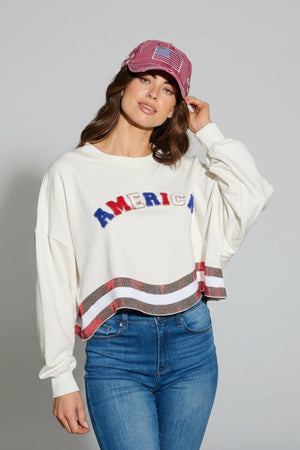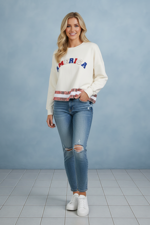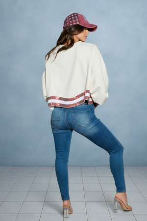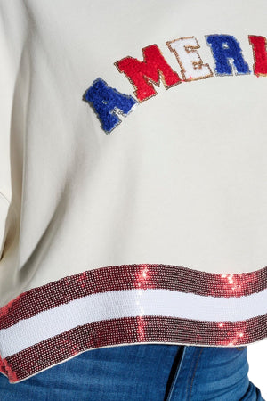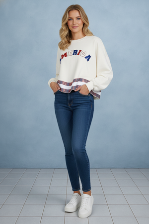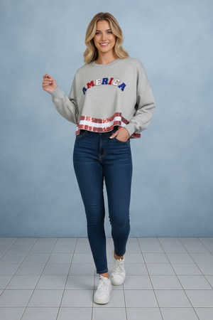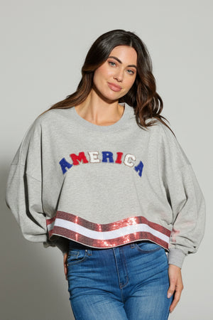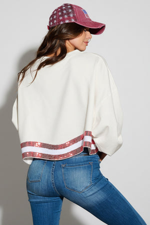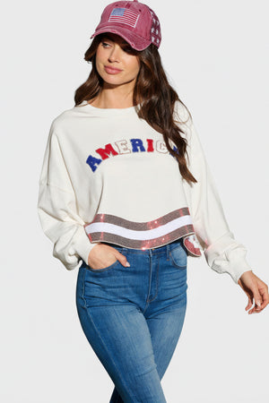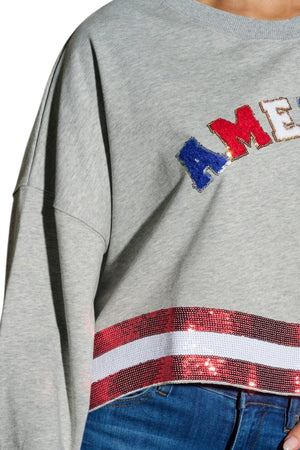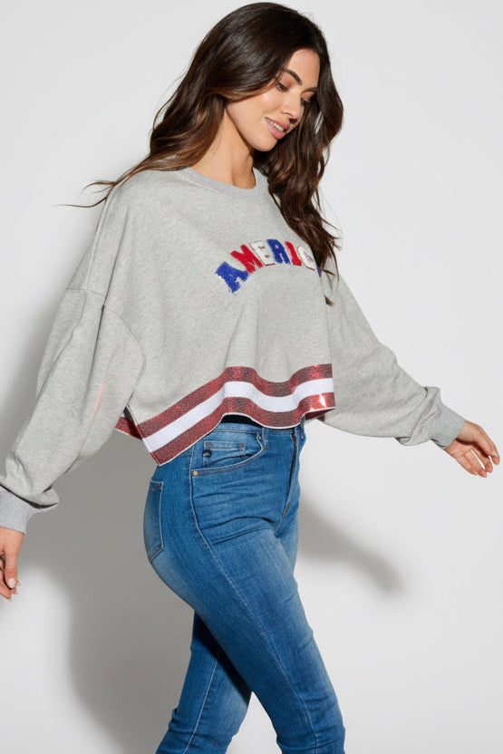 THE AMERICANA CREW LONG SLEEVE SEQUIN CROP PULLOVER SWEATER