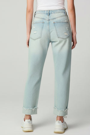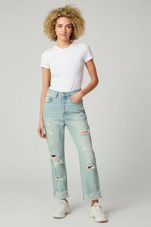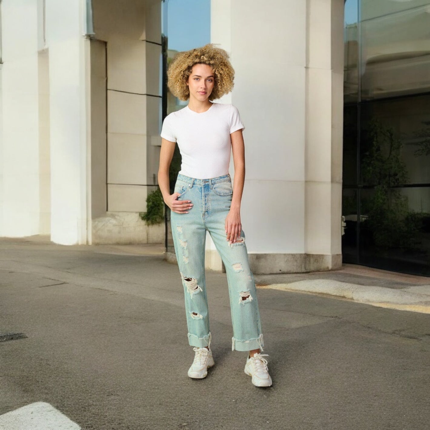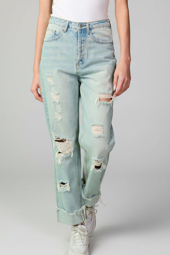Embrace timeless style with these light blue destroyed 90's cuffed straight leg denim jeans. Designed for comfort and effortless cool, their relaxed fit and distressed details make them a must-have for any wardrobe. Elevate your look and stand out with authentic vintage-inspired denim that never goes out of style.