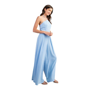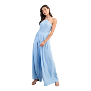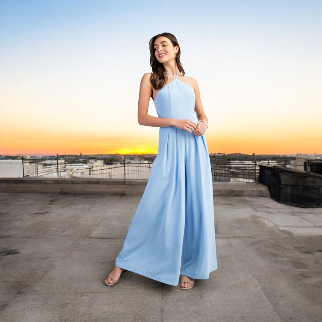 TWILIGHT STROLL BLUE HALTER NECK WIDE LEG JUMPSUIT