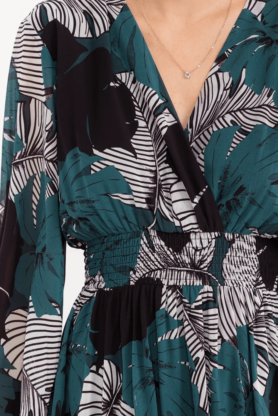 Lightweight polyester fabric, smock waist for a tailored fit, V-neckline for elegance, suitable for all seasons, popular with modern boutiques, perfect for day-to-night transitions.