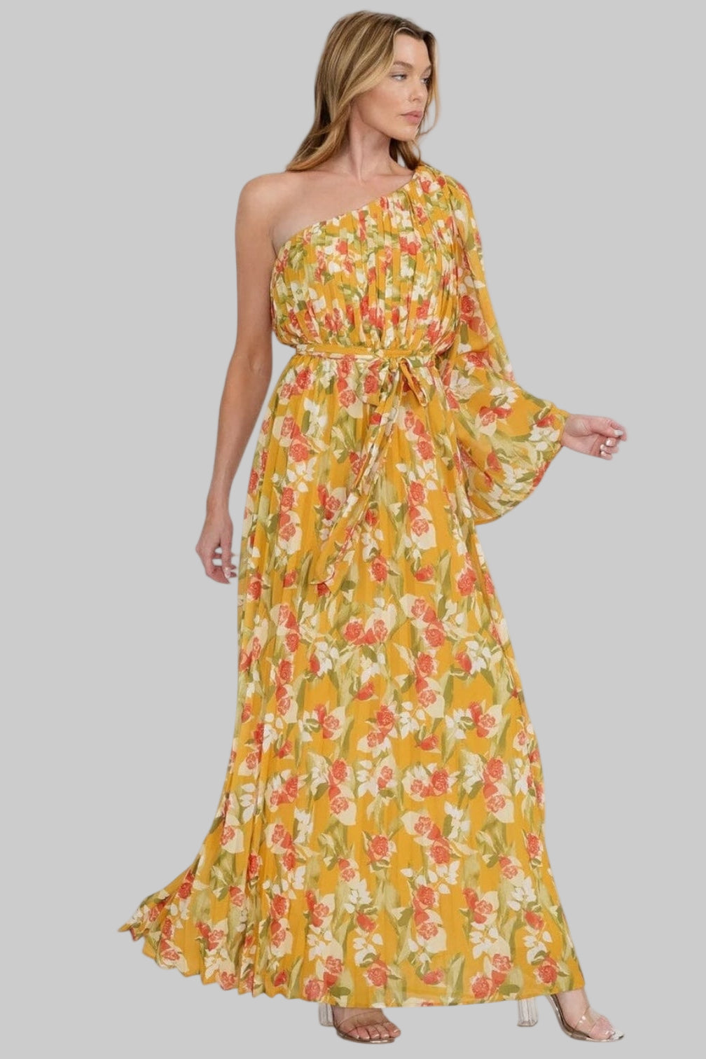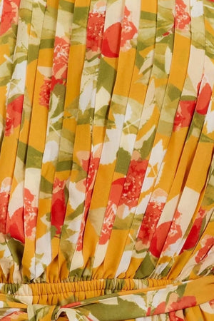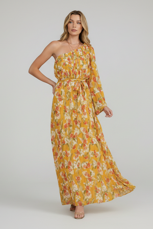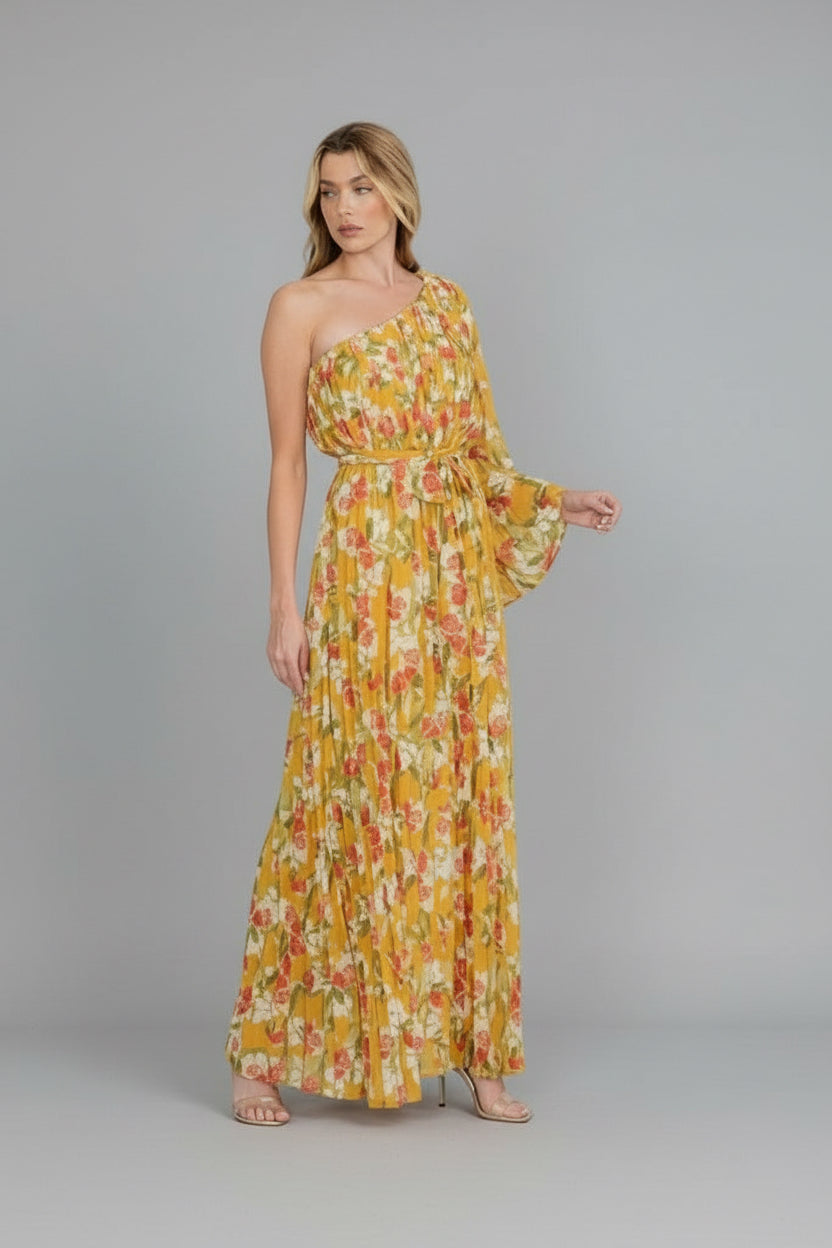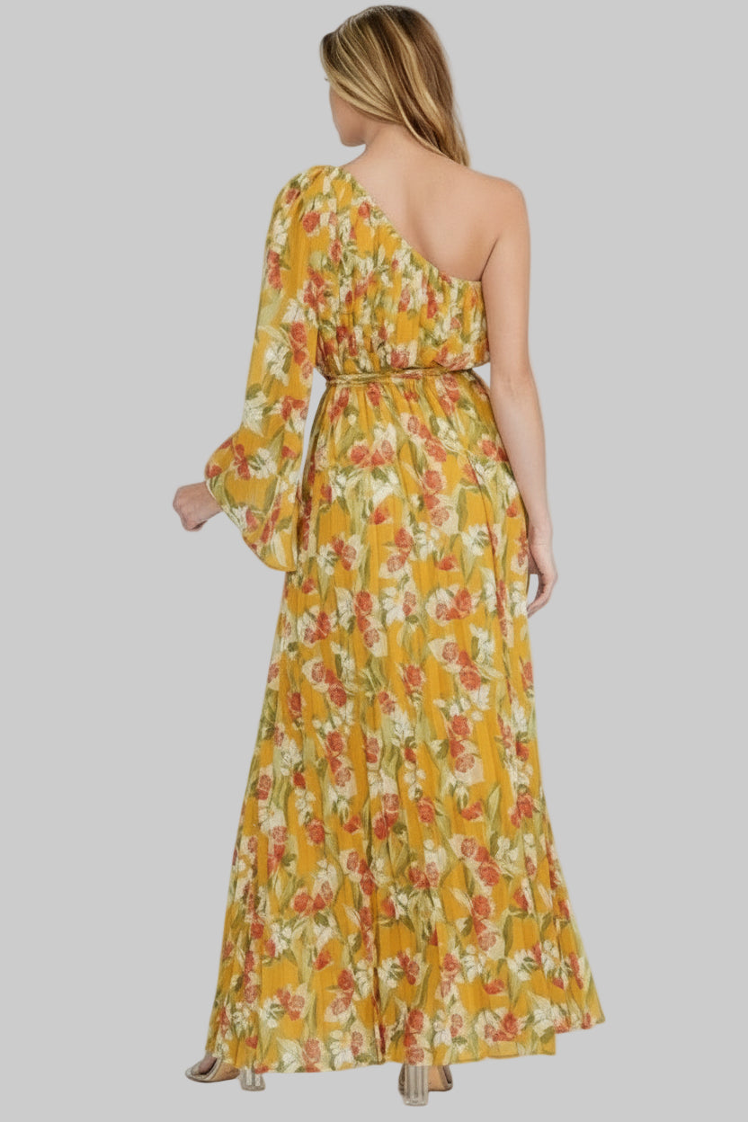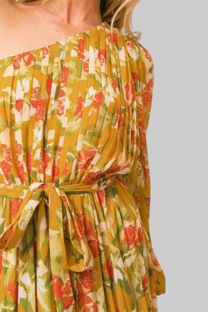 PLEATED WOVEN MUSTARD FLORAL ONE SHOULDER TIE WAIST MAXI DRESS