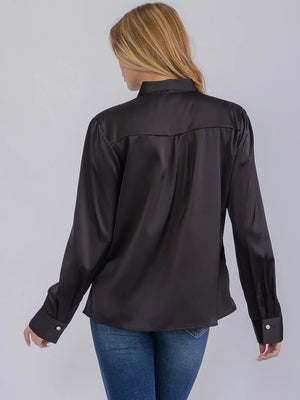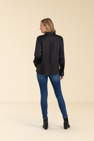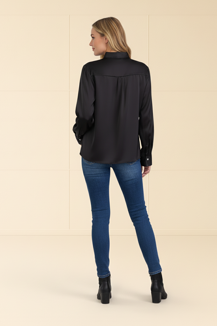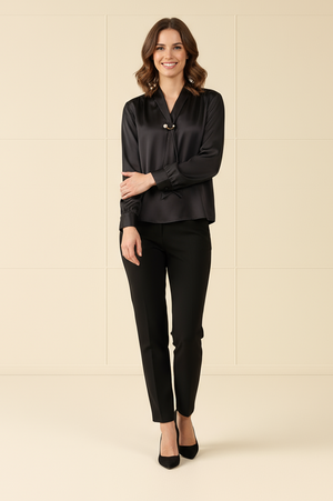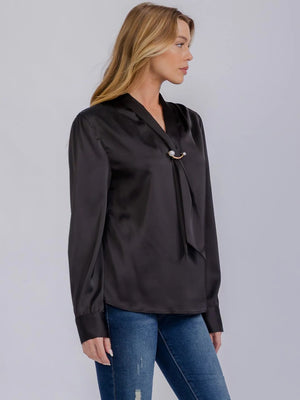 long sleeve design, V-neck silhouette, scarf detailing, lightweight fabric, breathable material, versatile styling, relaxed fit, chic and modern aesthetic