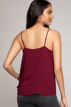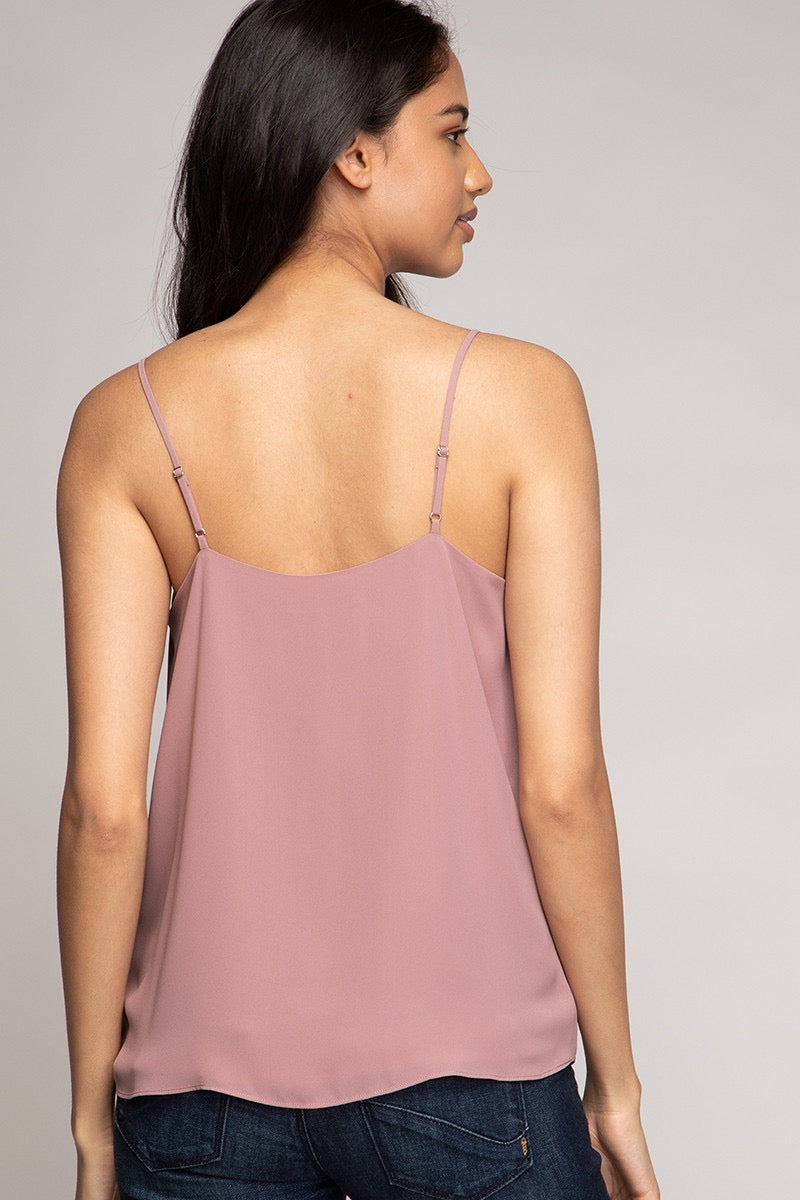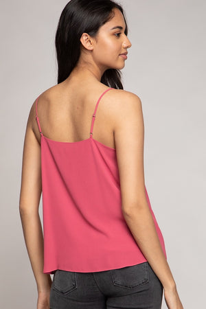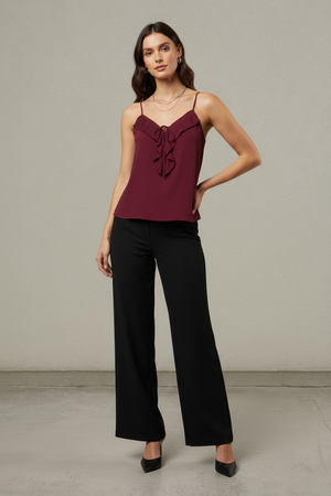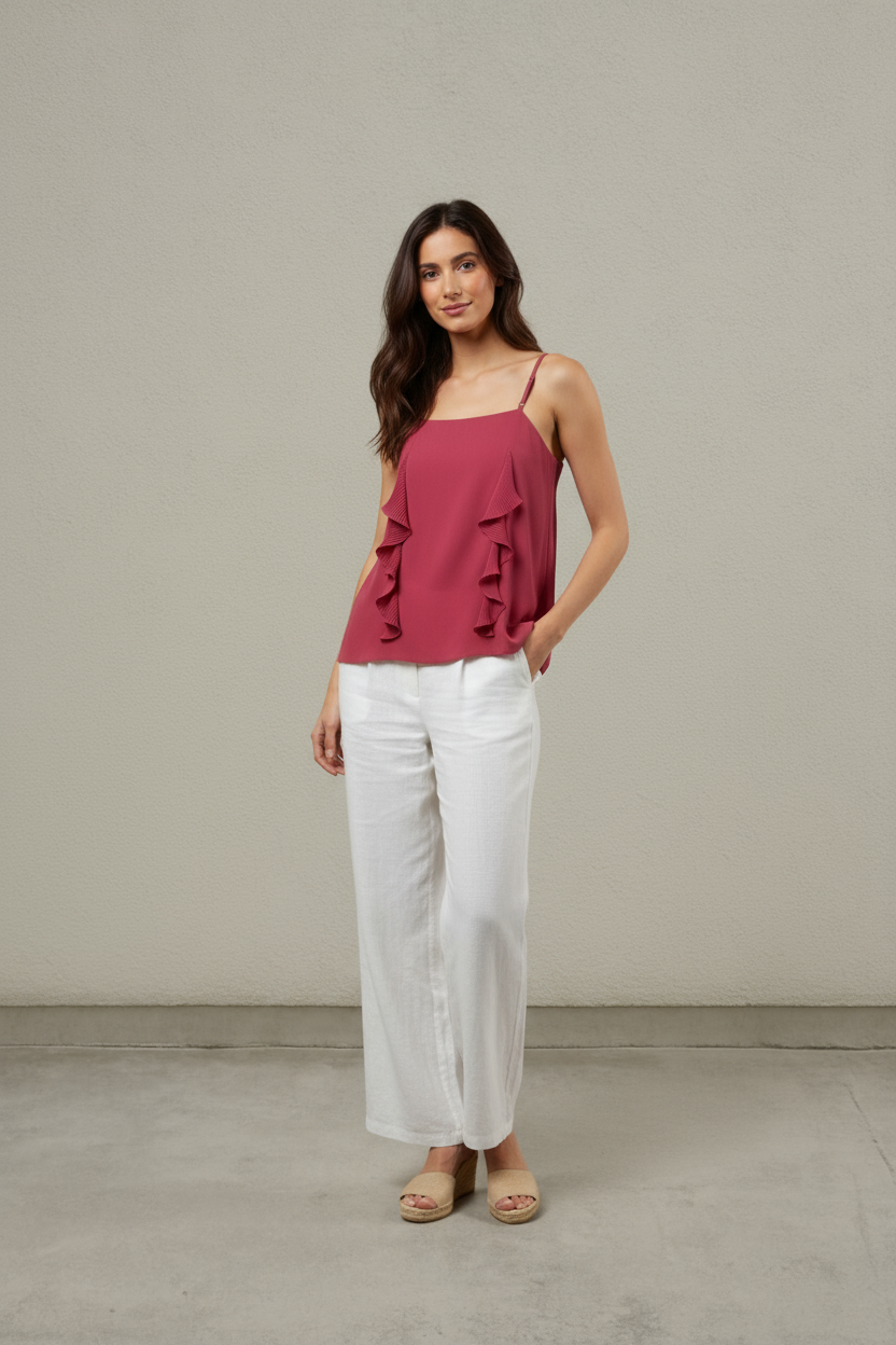 Cami With Pleated Ruffle Detail Delicate pleated ruffles add soft texture to this streamlined cami. Lightweight woven fabric with adjustable straps for an easy, flattering fit.