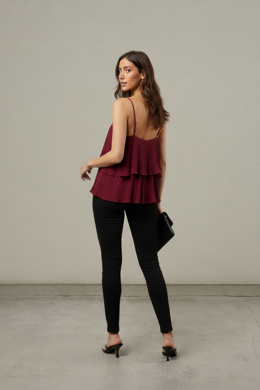 The Pleated Ruffle Cascade Cami is a must-have piece that elevates your wardrobe instantly. Featuring graceful pleats and a charming cascade of ruffles, it adds movement and sophistication to any look. Its versatile design makes it perfect for dressing up or down, ensuring you feel confident and stylish in every setting. Make this cami your go-to choice for effortless elegance and undeniable appeal